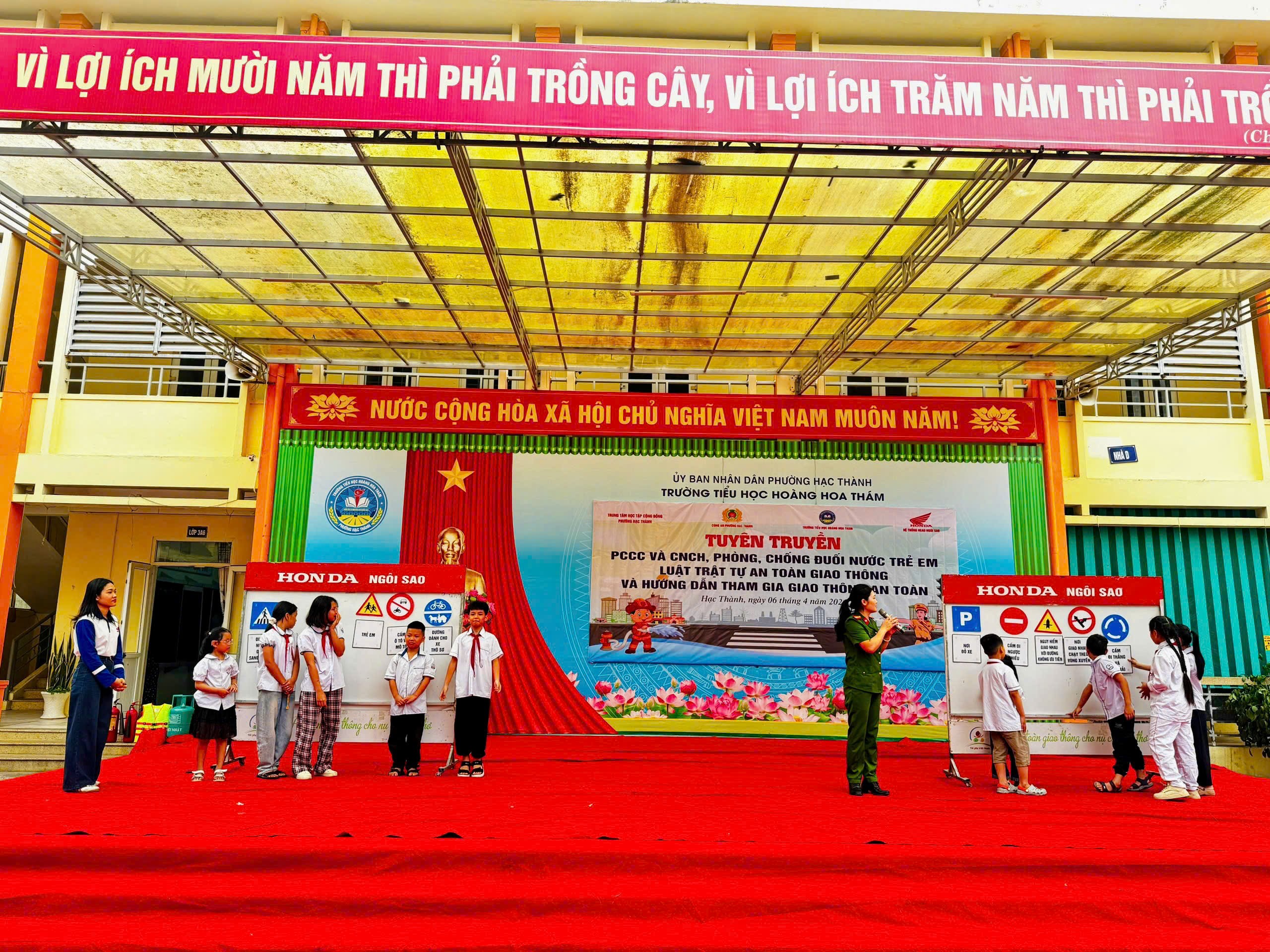 Sáng 06/4/2026, trong khuôn khổ chuỗi hoạt động của Trung tâm học tập cộng đồng phường Hạc Thành, Công an phường Hạc Thành đã phối hợp với Trường Tiểu học Hoàng Hoa Thám tổ chức buổi tuyên truyền, phổ biến kiến thức về phòng cháy, chữa cháy (PCCC) và cứu nạn, cứu hộ (CNCH); phòng, chống tai nạn đuối nước trẻ em; pháp luật về trật tự an toàn giao thông và kỹ năng tham gia giao thông an toàn cho học sinh.