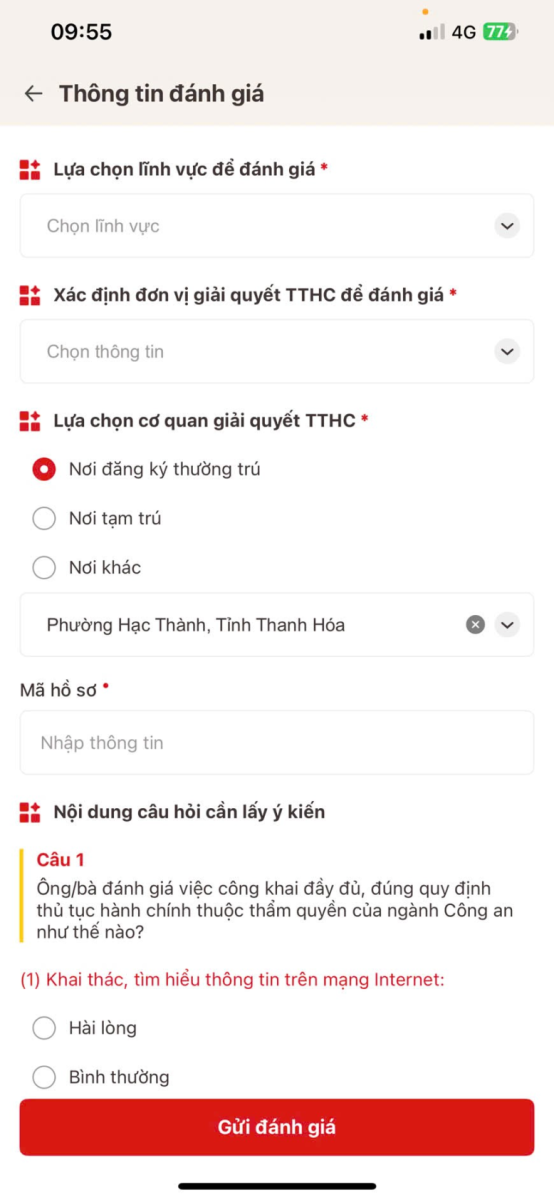 Bước 5: Lựa chọn lĩnh vực đánh giá (lĩnh vực thuộc thẩm quyền giải quyết của Phòng nghiệp vụ cấp tỉnh hoặc Công an các xã, phường); Xác định đơn vị giải quyết TTHC (cấp thực hiện; cấp tỉnh/thành phố hoặc cấp xã/phường). Lựa chọn cơ quan giải quyết TTHC và nhập mã hồ sơ (ví dụ: G01.851.108-251008-00004). Sau đó trả lời tất cả các câu hỏi từ câu 1 đến câu 7