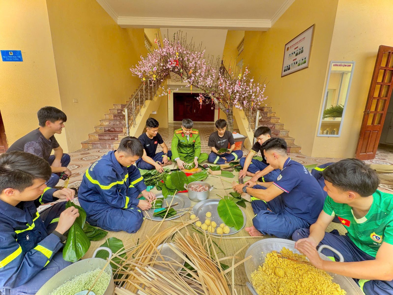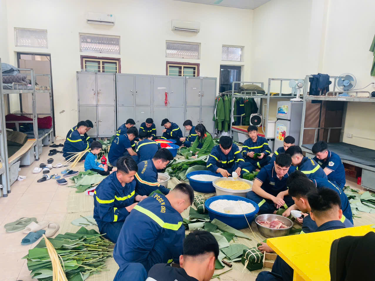 Ngay từ sáng sớm ngày 26 tháng Chạp, cán bộ, chiến sĩ đội Công tác chữa cháy và CNCH đã tất bật phân công công việc. Người chuẩn bị củi để đun bánh, người rửa lá dong, đãi gạo, ngâm đỗ; tất cả đều được chuẩn bị tươm tất, sạch sẽ. Những tàu lá dong xanh mướt, những chậu gạo nếp trắng ngần, đỗ xanh vàng ươm…được lựa chọn kỹ càng.