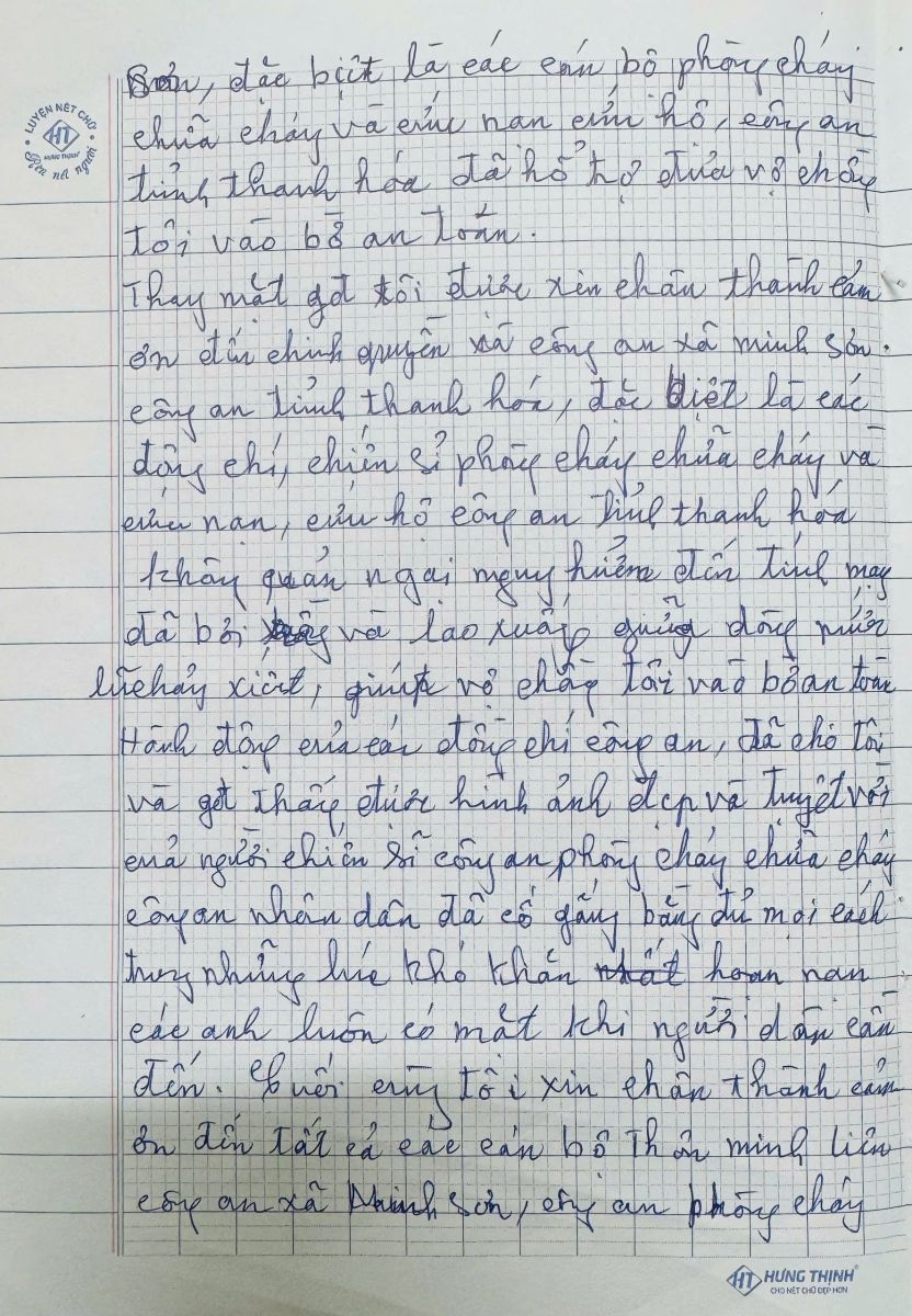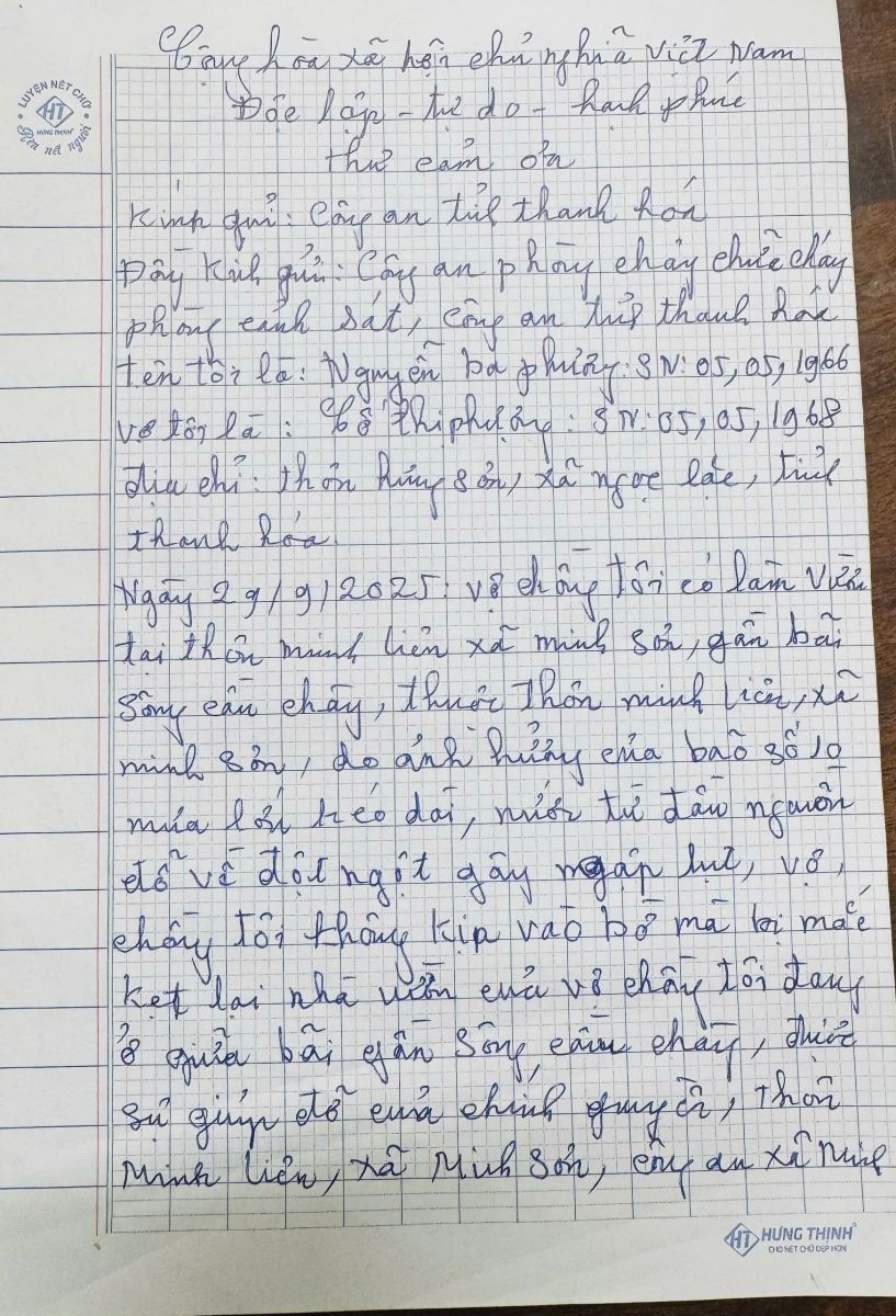 Mới đây, vợ chồng ông Nguyễn Bá Phương (trú tại xã Ngọc Lặc, tỉnh Thanh Hóa) đã gửi bức thư cảm ơn chân thành đến lực lượng Cảnh sát Cảnh sát PCCC và CNCH, công an xã, chính quyền địa phương, những người đã kịp thời ứng cứu, đưa ông bà thoát khỏi vùng nguy hiểm trong đợt lũ dữ xảy ra tại xã Minh Sơn đợt cuối tháng 9 vừa qua.