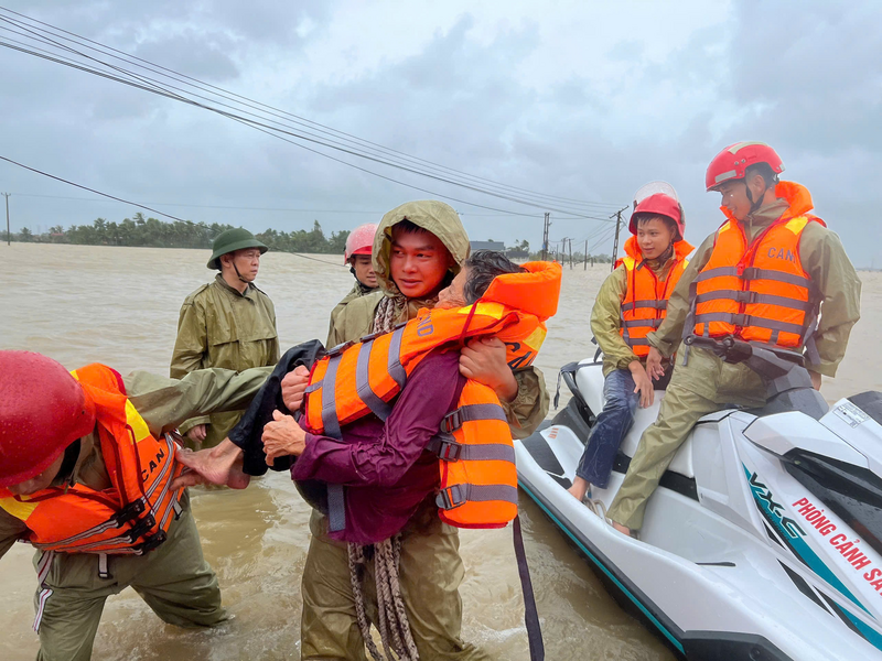 (5) Vào khoảng 15 giờ 40 phút, ngày 29/9, giữa dòng nước chảy xiết, các chiến sĩ Cảnh sát PCCC và CNCH đã dùng dây cứu hộ giải cứu 8 người trong 2 gia đình ở xã Điền Lư.