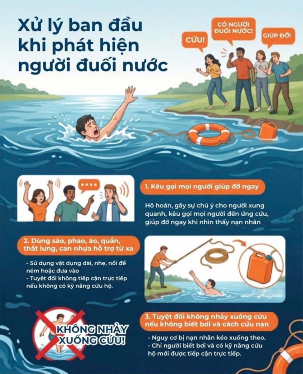 Khi phát hiện hoặc nghi ngờ có người đuối nước, cần: Gọi ngay số 114 – Trung tâm Thông tin chỉ huy Phòng Cảnh sát PCCC và CNCH hoặc liên hệ trực tiếp Công an xã, phường gần nhất để được hỗ trợ kịp thời.