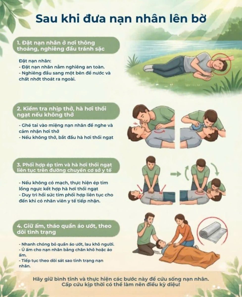 - Nếu nạn nhân vẫn còn thở, đặt nằm nghiêng, tháo bỏ quần áo ướt, giữ ấm bằng chăn hoặc khăn khô.