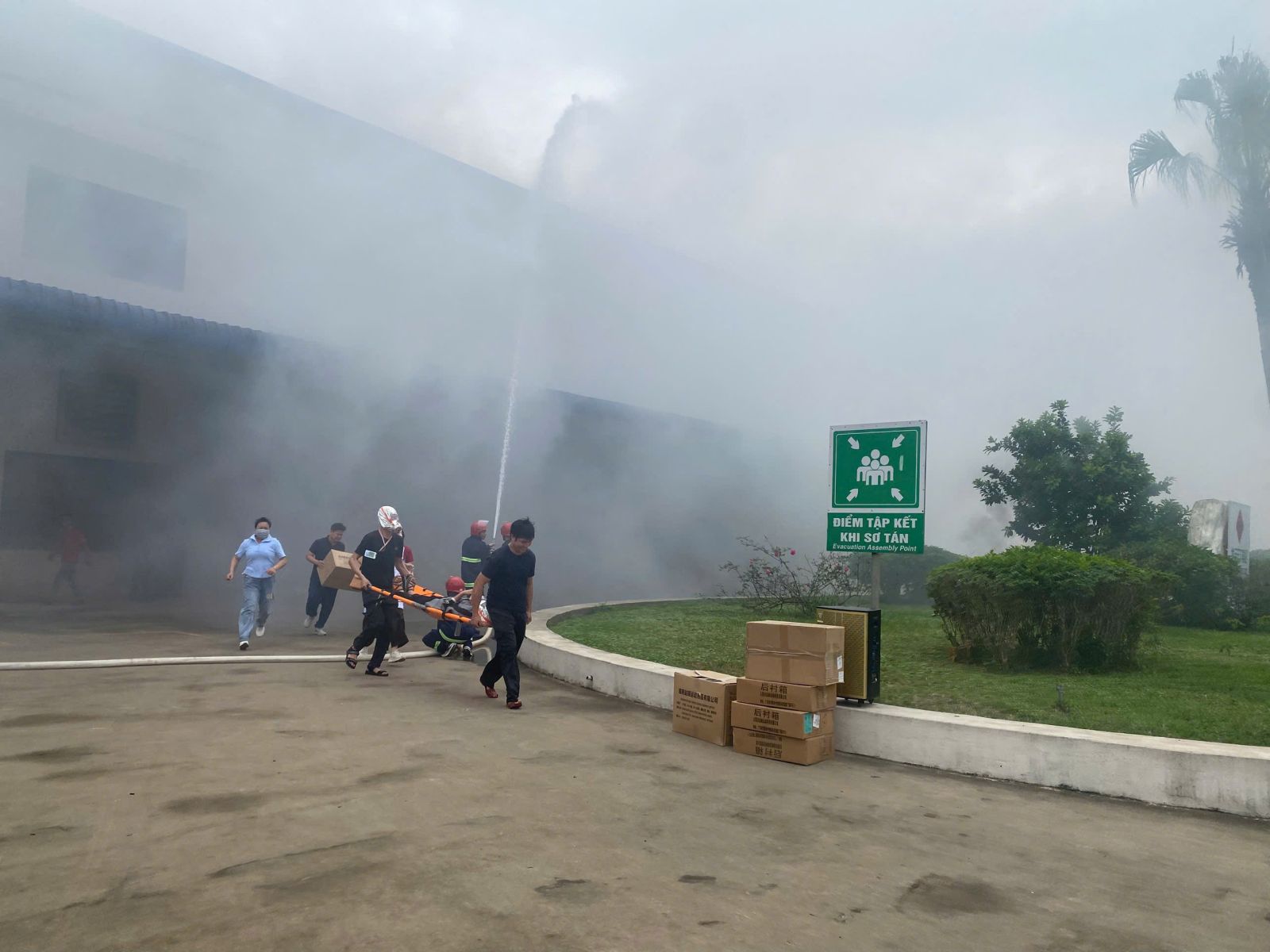 Với tình huống giả định đám cháy xuất phát tại khu vực xưởng sản xuất do sự cố chạm, chập điện. Mặc dù đám cháy được phát hiện sớm, tuy nhiên, do trong xưởng chứa nhiều chất dễ cháy như: gỗ, mùn cưa, dung môi sơn…dẫn đến đám cháy bùng phát nhanh, khó kiểm soát. Lực lượng PCCC cơ sở khẩn trương triển khai các biện pháp khống chế đám cháy, ngăn chặn cháy lan, sơ tán tài sản, đồng thời gọi điện báo cháy cho lực lượng Cảnh sát PCCC và CNCH. Quá trình tham gia chữa cháy, do tác động trực tiếp của khói khí độc, nhiệt lượng tỏa ra từ đám cháy khiến một số công nhân bị thương, không thể tự di chuyển.