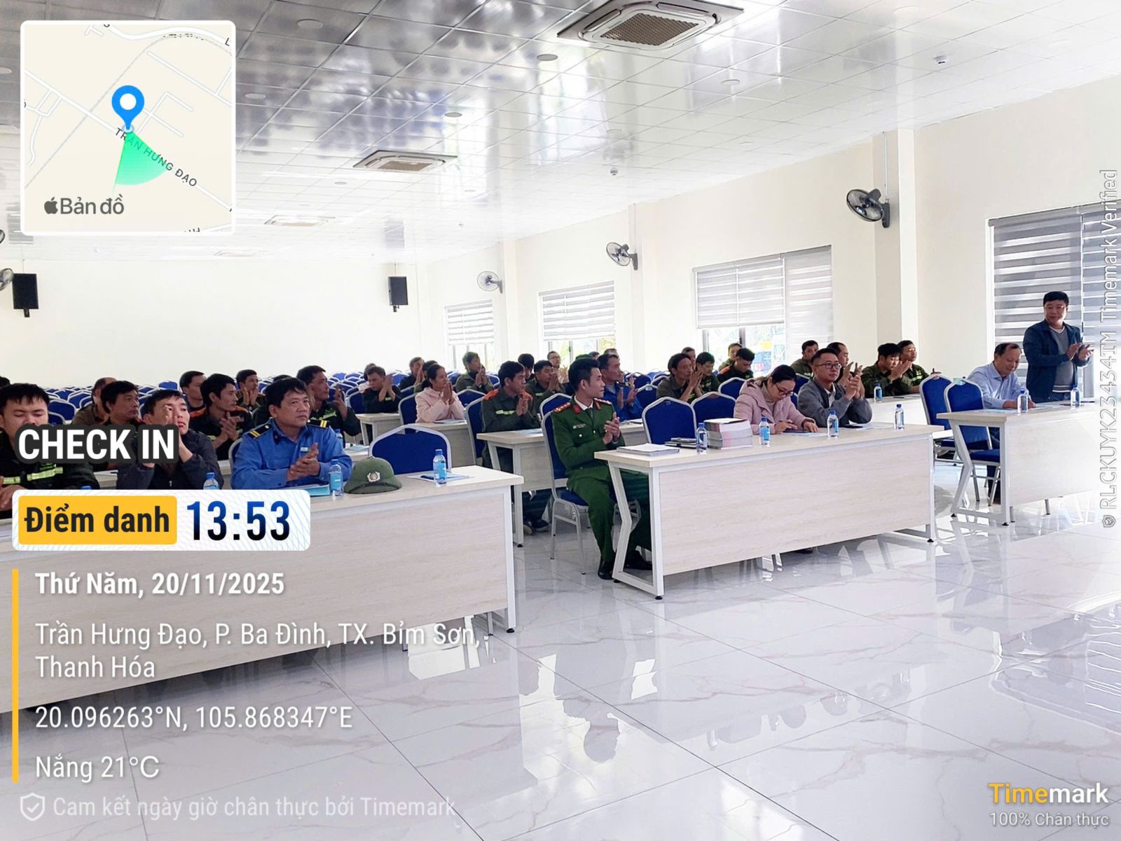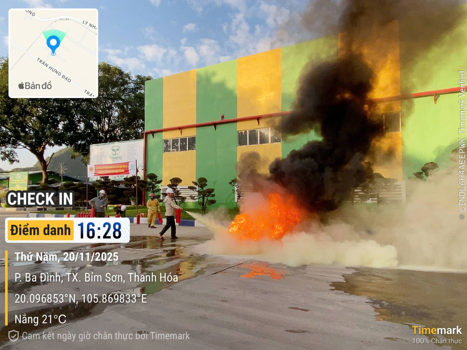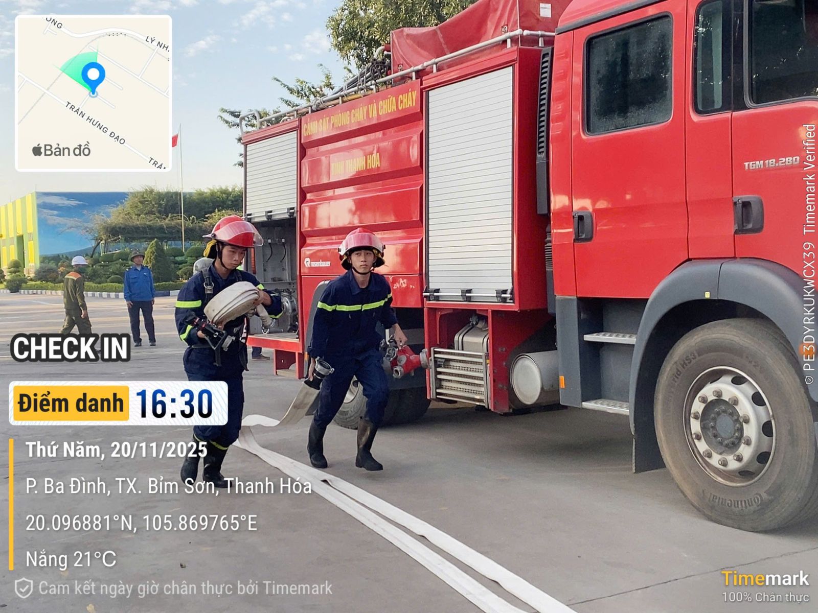 Sáng ngày 20/11/2025, tại khu B, KCN Bỉm Sơn, phường Bỉm Sơn, tỉnh Thanh Hóa, Đội chữa cháy và CNCH khu vực 3 phối hợp tổ chức thực tập phương án chữa cháy của cơ quan công an tại Công ty cổ phần Công nông nghiệp Tiến Nông.