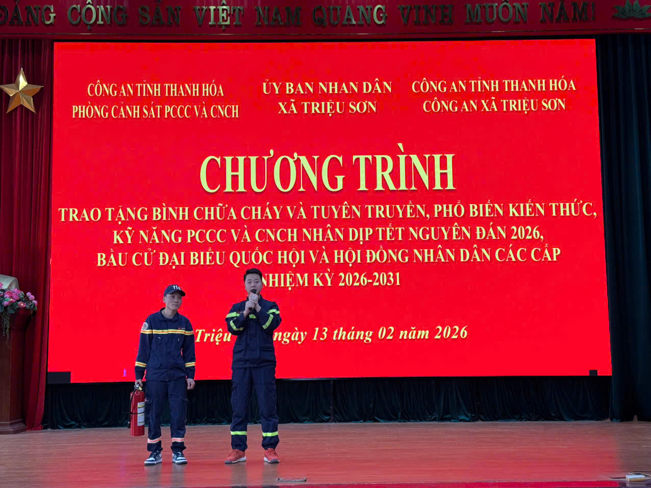 Sáng 13/02/2026, Phòng Cảnh sát PCCC và CNCH Công an tỉnh phối hợp với UBND và Công an xã Triệu Sơn tổ chức chương trình trao tặng bình chữa cháy và tuyên truyền, phổ biến kiến thức, kỹ PCCC và CNCH nhằm bảo đảm an toàn trong dịp Tết Nguyên đán Bính Ngọ và phục vụ bầu cử đại biểu Quốc hội, đại biểu Hội đồng nhân dân các cấp nhiệm kỳ 2026 - 2031.