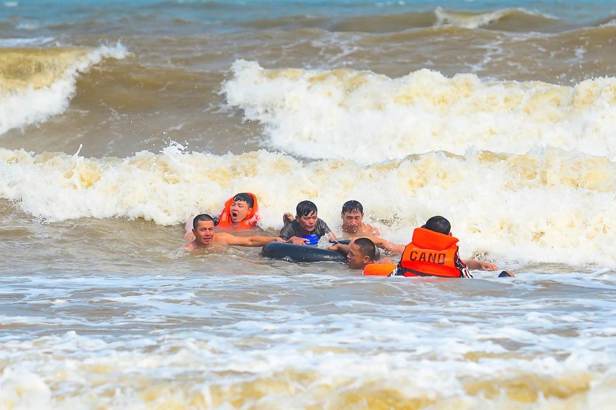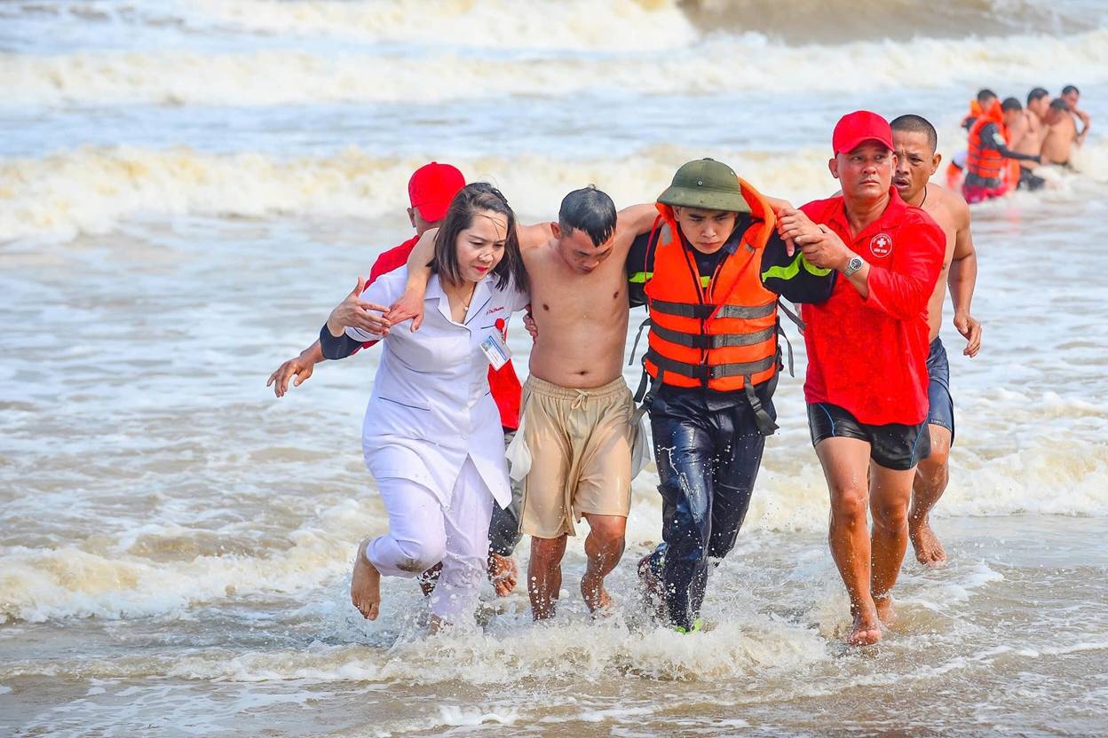 Ở tình huống giả định khác, một công ty tổ chức hoạt động team building tại bãi tắm A, phường Sầm Sơn. Sau đó, một nhóm người xuống tắm biển thì gặp dòng chảy xa bờ, cách bờ khoảng 60m, khiến 10 người bị cuốn trôi ra xa. Dù cố bơi ngược vào bờ nhưng 6 người rơi vào trạng thái hoảng loạn, kiệt sức, chới với giữa dòng nước; 2 người khác bị cuốn ra xa hơn, cách bờ khoảng 90m, trong tình trạng sức khỏe yếu; 2 người còn lại mất tích.