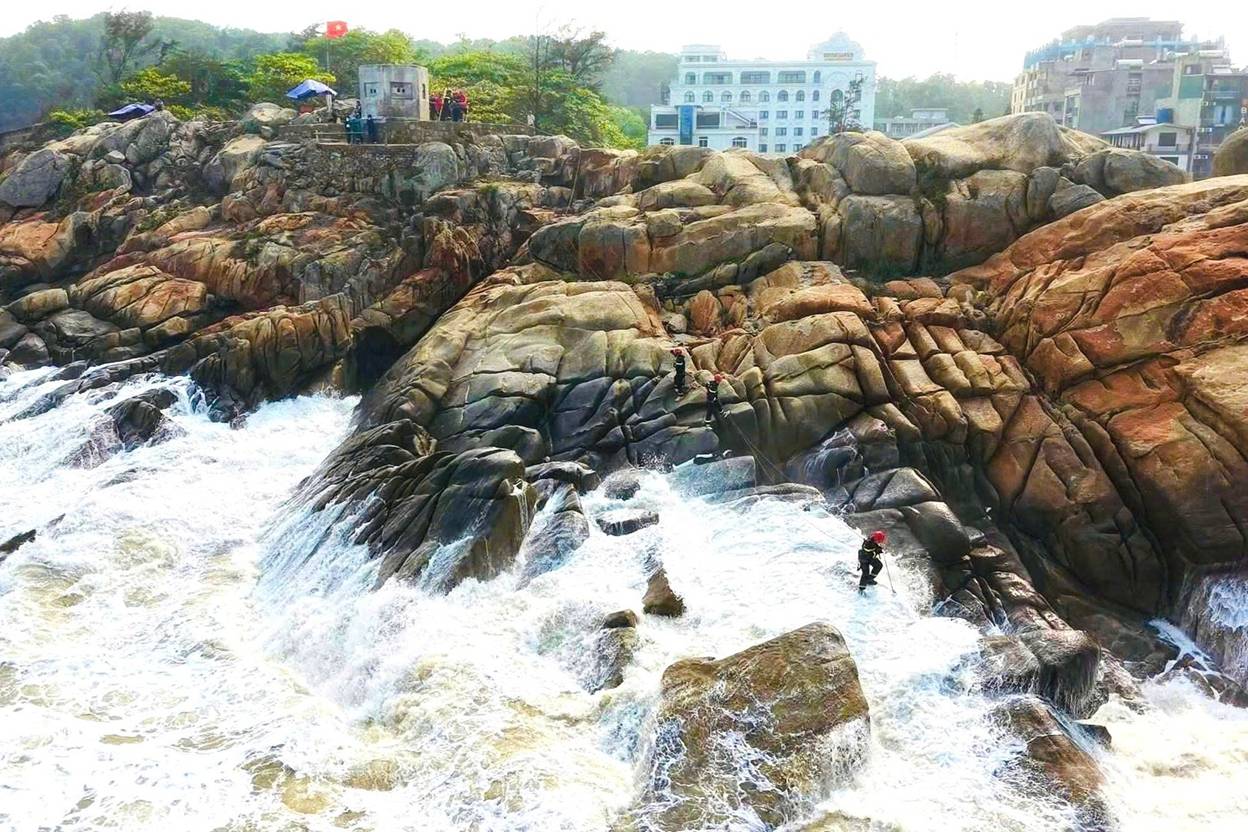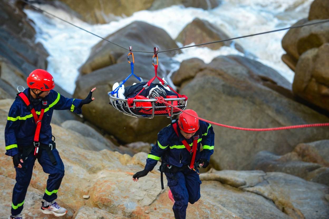 Do địa hình hiểm trở, sóng lớn khiến việc tiếp cận bằng đường biển không khả thi. Lực lượng chức năng phải triển khai phương án khác, dùng cầu dây nghiêng - kỹ thuật chuyên sâu thường áp dụng trong địa hình phức tạp để cứu nạn nhân.
