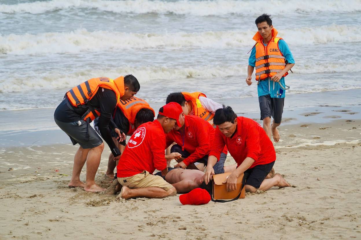 Theo tình huống giả định, có một gia đình gồm 4 người đang tắm biển. Bất ngờ, sóng lớn đánh mạnh vào phao khiến 3 người chới với giữa dòng nước. Người còn lại thấy vậy thì hoảng loạn, mất bình tĩnh, kêu cứu nhưng bị sóng cuốn ngày càng xa bờ.