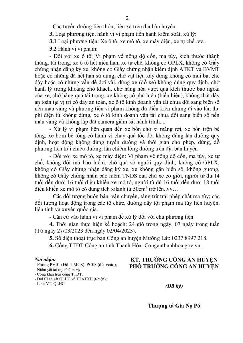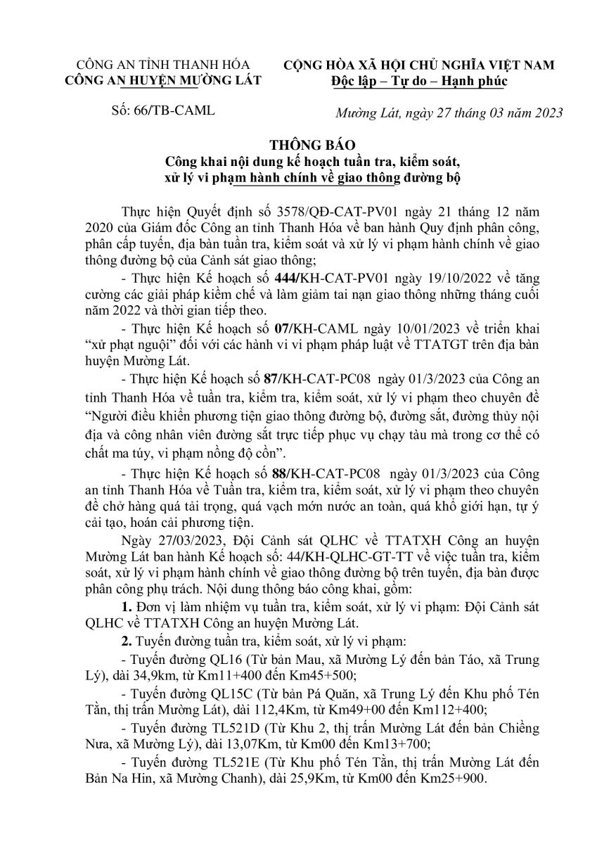 Thông báo công khai nội dung TTKS, XLVP của Đội Cảnh sát QLHC về TTATXH Công an huyện Mường Lát (Từ ngày 27/03/2023 đến 02/04/2023)