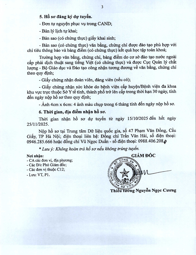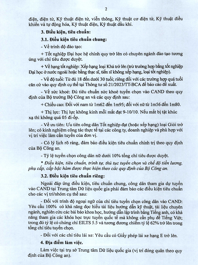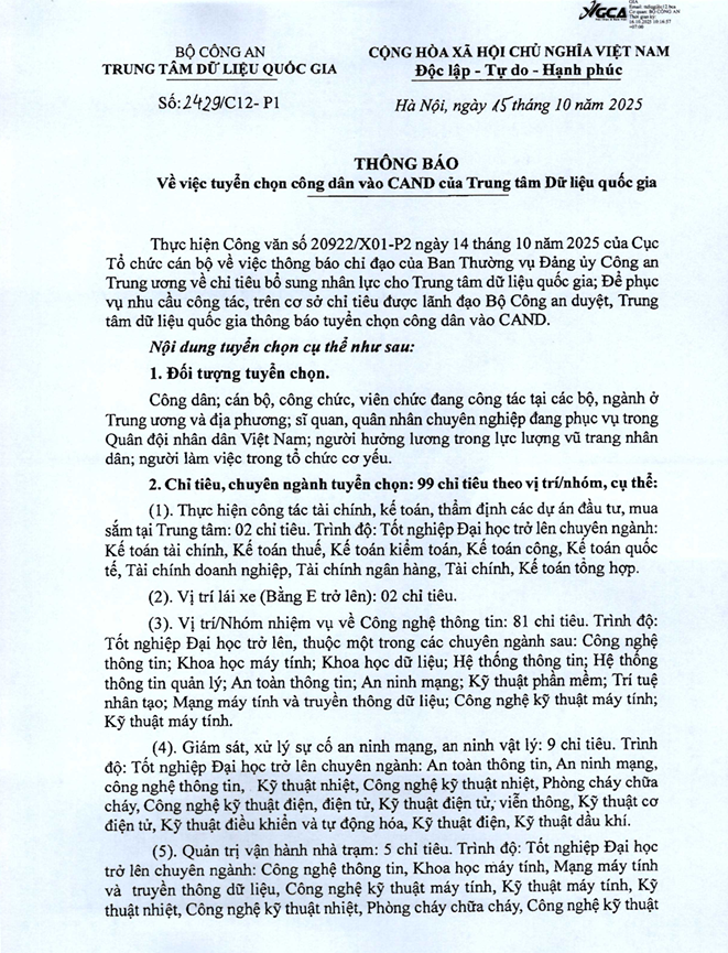 Thông báo về việc tuyển chọn công dân vào CAND của Trung tâm Dữ liệu quốc gia