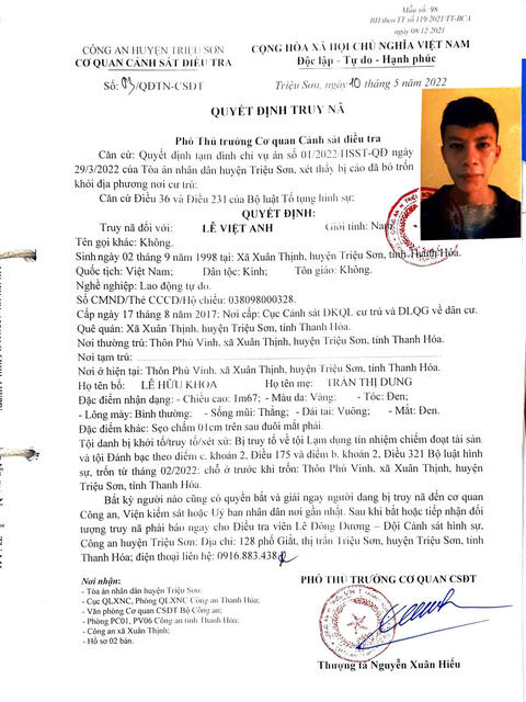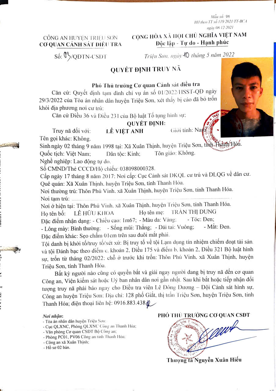 Đơn vị ra quyết định: Cơ quan CSĐT Công an huyện Triệu Sơn