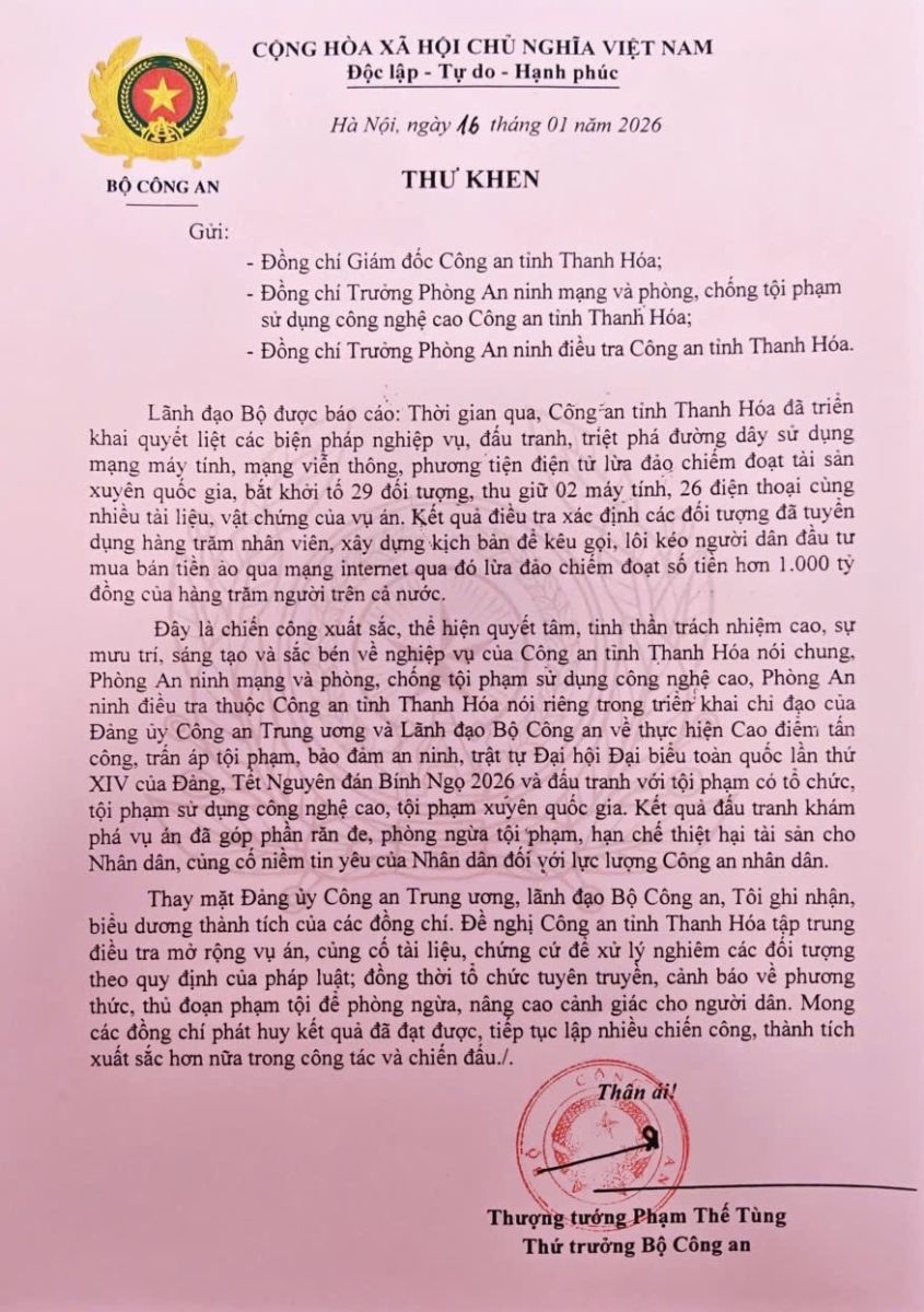Ngày 16/1/2026, Thượng tướng Phạm Thế Tùng, Thứ trưởng Bộ Công an đã có Thư khen Công an tỉnh Thanh Hóa về thành tích đấu tranh, triệt phá thành công đường dây sử dụng mạng máy tính, mạng viễn thông, phương tiện điện tử lừa đảo chiếm đoạt tài sản xuyên quốc gia.