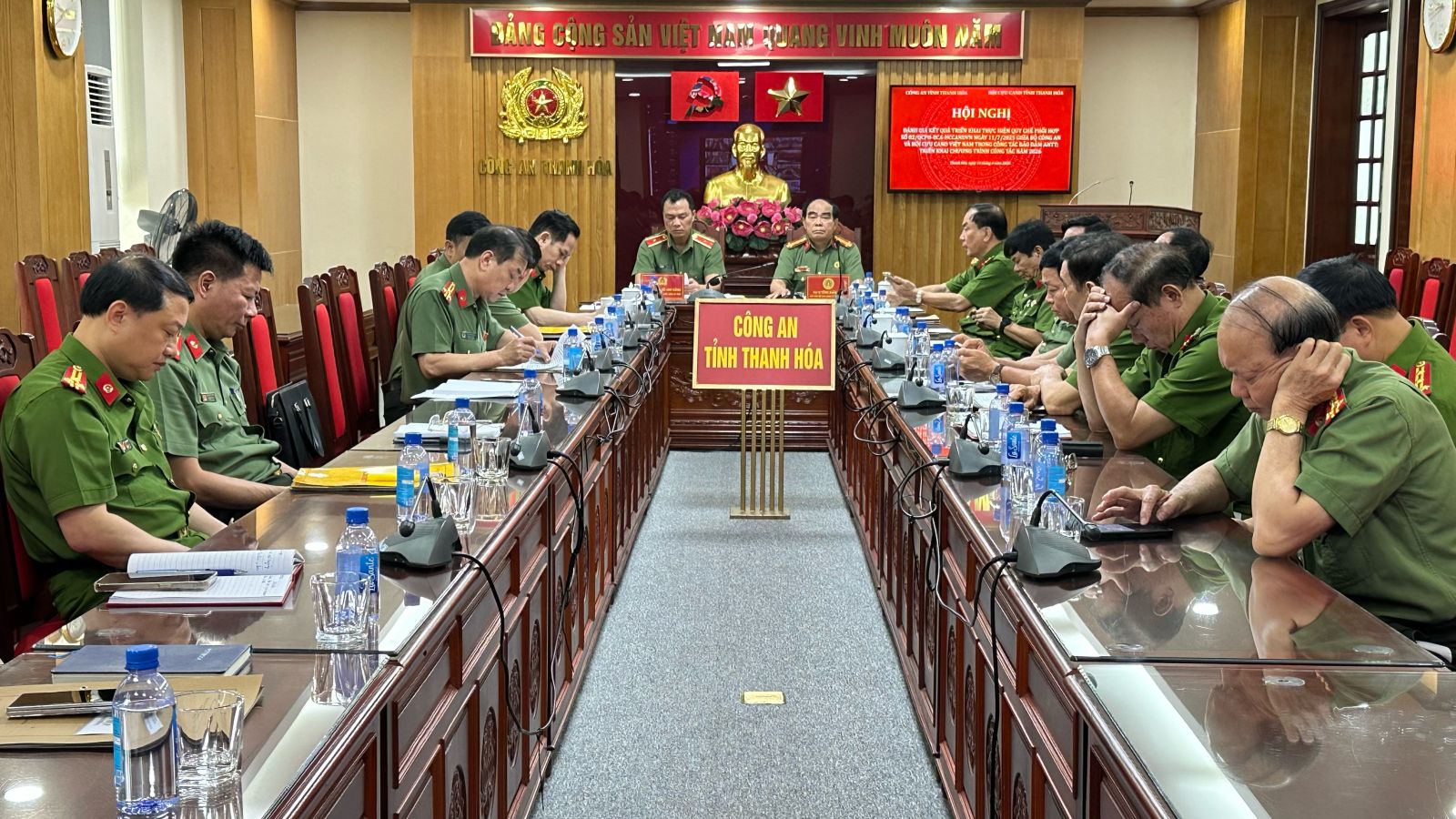 Tại điểm cầu Công an tỉnh Thanh Hoá, Đồng chí Thiếu Tướng Tô Anh dũng, Giám đốc Công an tỉnh, Đại tá Tống Xuân Giáp, Chủ tịch Hội Cựu CAND tỉnh Thanh Hoá, các đồng chí Phó giám đốc Công an tỉnh, đại diện lãnh đạo một số phòng chức năng cùng dự Hội nghị.