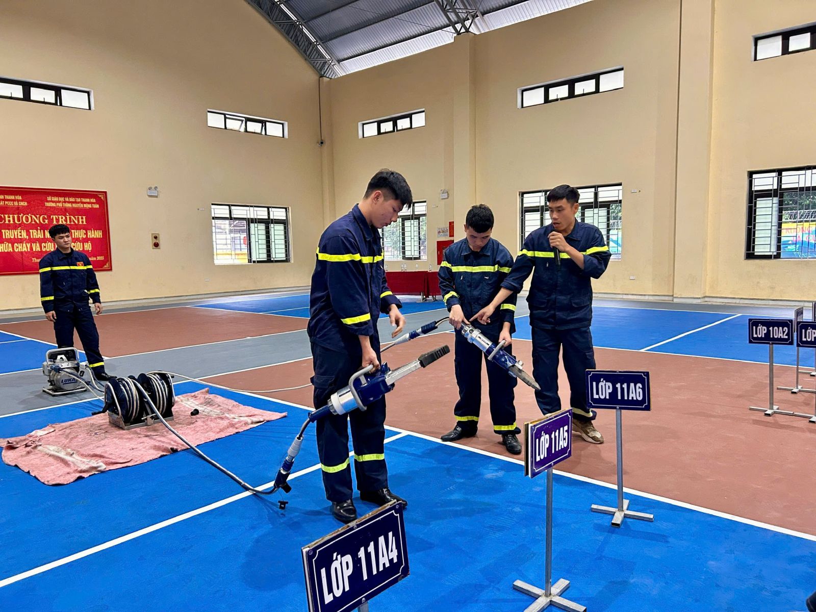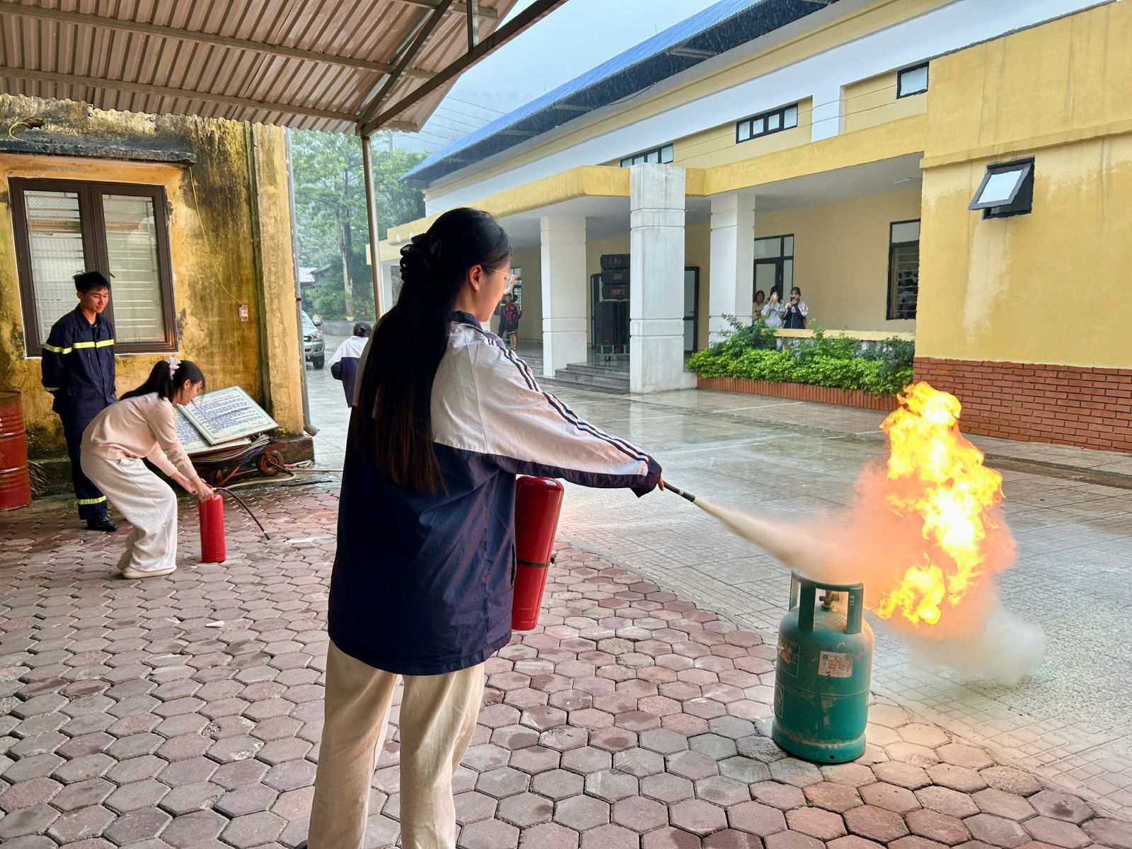 Học sinh thực hành kỹ năng thoát hiểm, sơ cứu người bị nạn và sử dụng bình chữa cháy