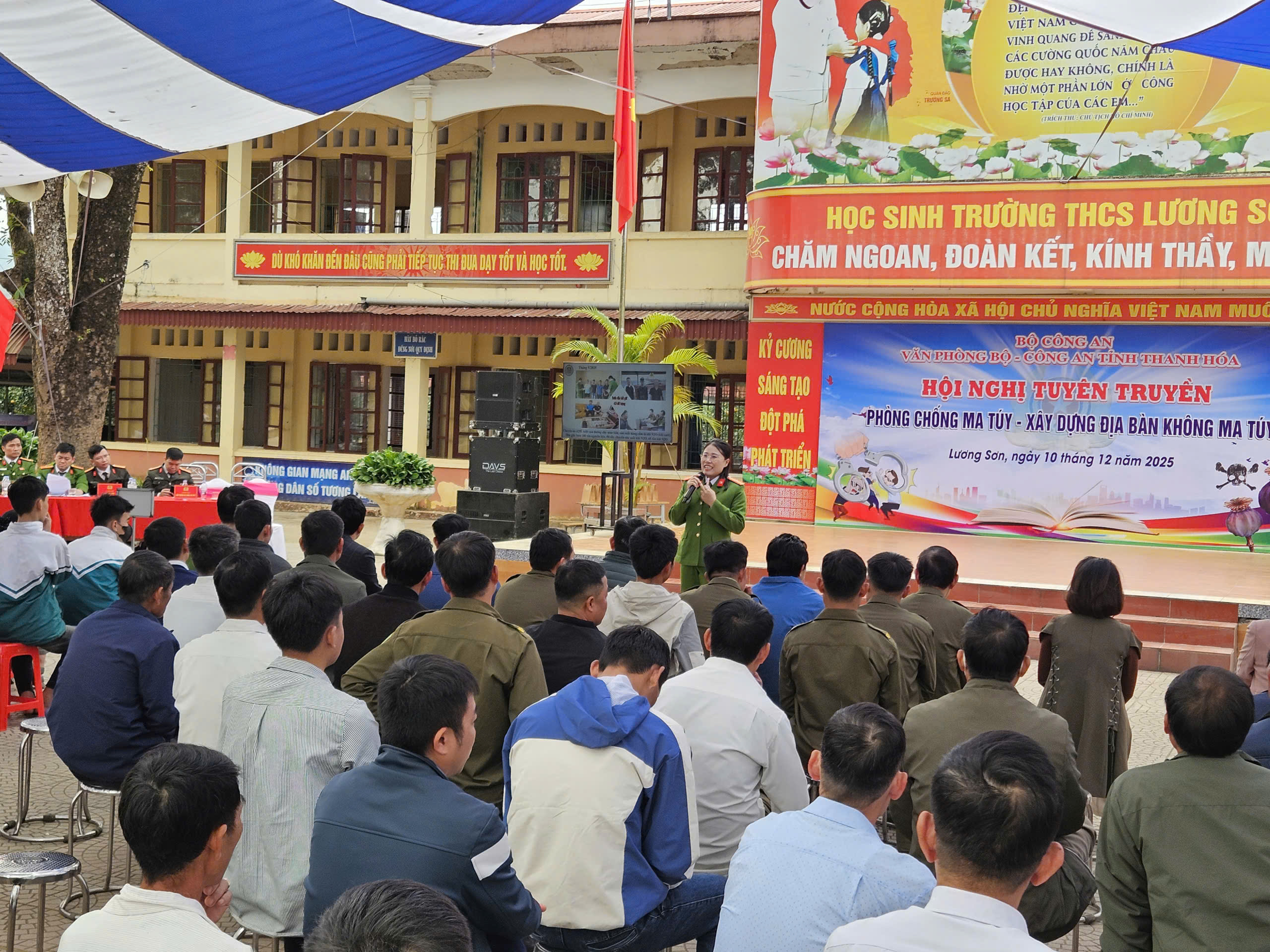 Nhằm nâng cao nhận thức và trang bị kiến thức, kỹ năng phòng, chống tội phạm, tệ nạn ma tuý, đồng thời ngăn chặn nguy cơ ma tuý xâm nhập học đường và triển khai Đề án xây dựng “xã, phường không ma tuý”, chiều 10/12/2025, Văn phòng Bộ Công an đã phối hợp với Công an tỉnh Thanh Hoá, UBND xã Lương Sơn và Ban Giám hiệu Trường THCS Lương Sơn tổ chức buổi tuyên truyền pháp luật về phòng, chống ma tuý cho cán bộ, giáo viên và học sinh nhà trường.