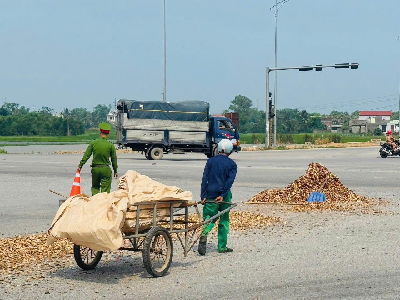 Đại uý Lê Xuân Hải cùng người dân xung quanh thu gom dăm gỗ, bảo đảm an toàn giao thông cho người đi đường