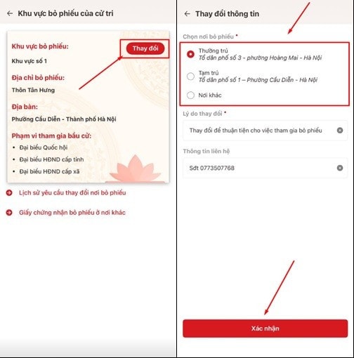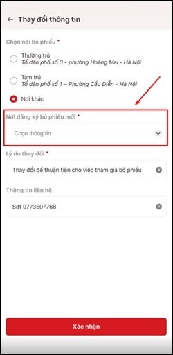 Màn hình sau khi đã chọn nơi khác để bỏ phiếu: