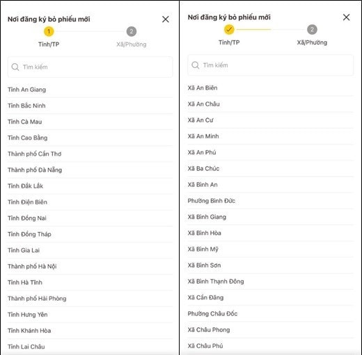 Nhấn vào "Nơi đăng ký bỏ phiếu mới", hệ thống hiển thị màn chọn địa chỉ:
