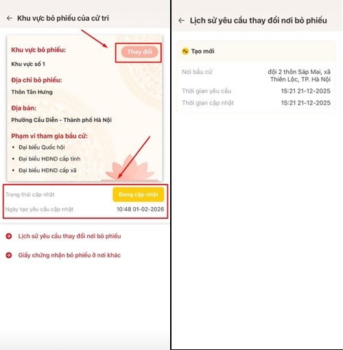 Nhấn "Quay lại" để quay lại màn Khu vực bỏ phiếu. Nhấn "Lịch sử yêu cầu thay đổi nơi bỏ phiếu" để xem lịch sử. Nhấn "Giấy chứng nhận bỏ phiếu ở nơi khác" để xem Giấy chứng nhận bỏ phiếu ở nơi khác: Giấy chứng nhận bỏ phiếu nơi khác hiển thị khi thông tin bỏ phiếu hiện tại của công dân là “nơi khác”.