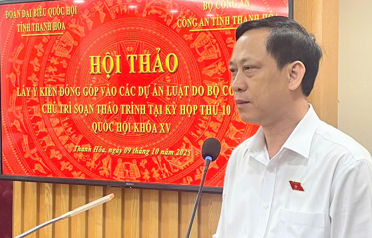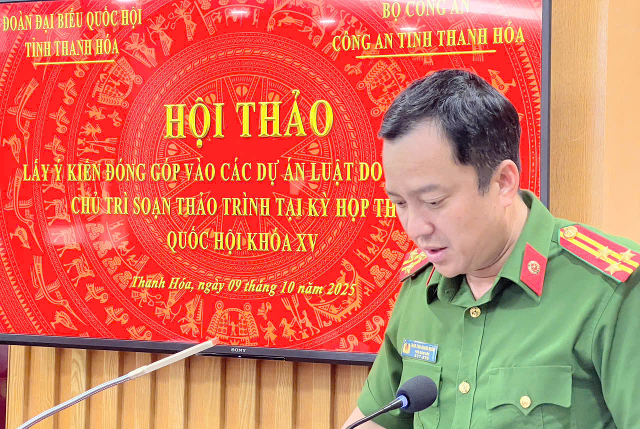 Chiều 9/10, Công an tỉnh Thanh Hóa đã tổ chức Hội thảo lấy ý kiến đóng góp vào các dự án Luật do Bộ Công an chủ trì soạn thảo, trình tại kỳ họp thứ 10, Quốc hội khóa XV. Dự hội thảo có đồng chí Mai Văn Hải, Tỉnh ủy viên, Phó Trưởng Đoàn ĐBQH tỉnh; Thượng tá Trần Thái Quang Hoàng, Phó Giám đốc Công an tỉnh; đại diện lãnh đạo các sở, ngành có liên quan và đại diện lãnh đạo các phòng chức năng Công an tỉnh.