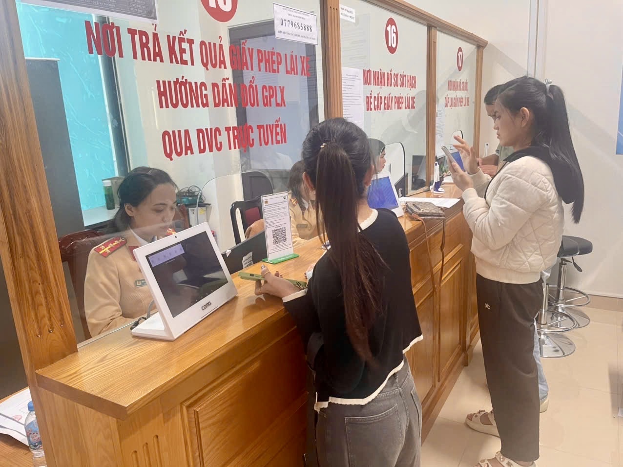 Tại quầy sát hạch và quản lý phương tiện, không khí làm việc cũng diễn ra khẩn trương, lực lượng chức năng cũng đã xử lý dứt điểm 108 hồ sơ cấp, đổi lại giấy phép lái xe. Cán bộ trực quầy sát hạch đã tập trung rà soát hồ sơ, hướng dẫn công dân hoàn thiện các thủ tục đăng ký sát hạch, đổi bằng lái một cách khoa học, đảm bảo đúng quy trình nghiệp vụ nhưng vẫn nhanh chóng.