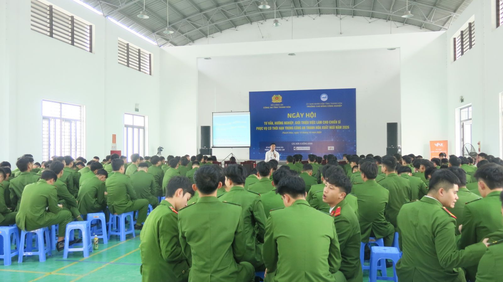 Tham dự ngày hội, các chiến sĩ phục vụ có thời hạn trong Công an Thanh Hóa xuất ngũ năm 2026, đã được nghe các báo cáo viên đến từ Trung tâm dịch vụ việc làm Sở Nội vụ tỉnh Thanh Hóa, Trường Cao đẳng công nghiệp Thanh Hóa và các doanh nghiệp có nhu cầu tuyển dụng lao động trên địa bàn chia sẻ những kiến thức, kỹ năng và tư vấn, định hướng nghề nghiệp; phổ biến các chính sách của Nhà nước về hỗ trợ đào tạo nghề, giải quyết việc làm và xuất khẩu lao động; nhu cầu tuyển dụng việc làm của các doanh nghiệp trên địa bàn tỉnh hiện nay.