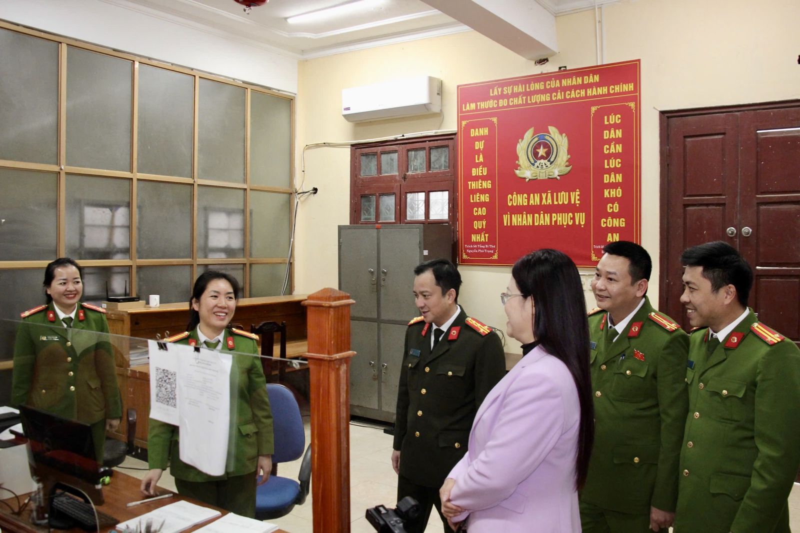 Đồng chí Đại tá Trần Thái Quang Hoàng, Phó Giám đốc Công an tỉnh thăm quan khu vực tiếp công dân và thu nhận hồ sơ cấp căn cước tại trụ sở Công an xã Lưu Vệ.