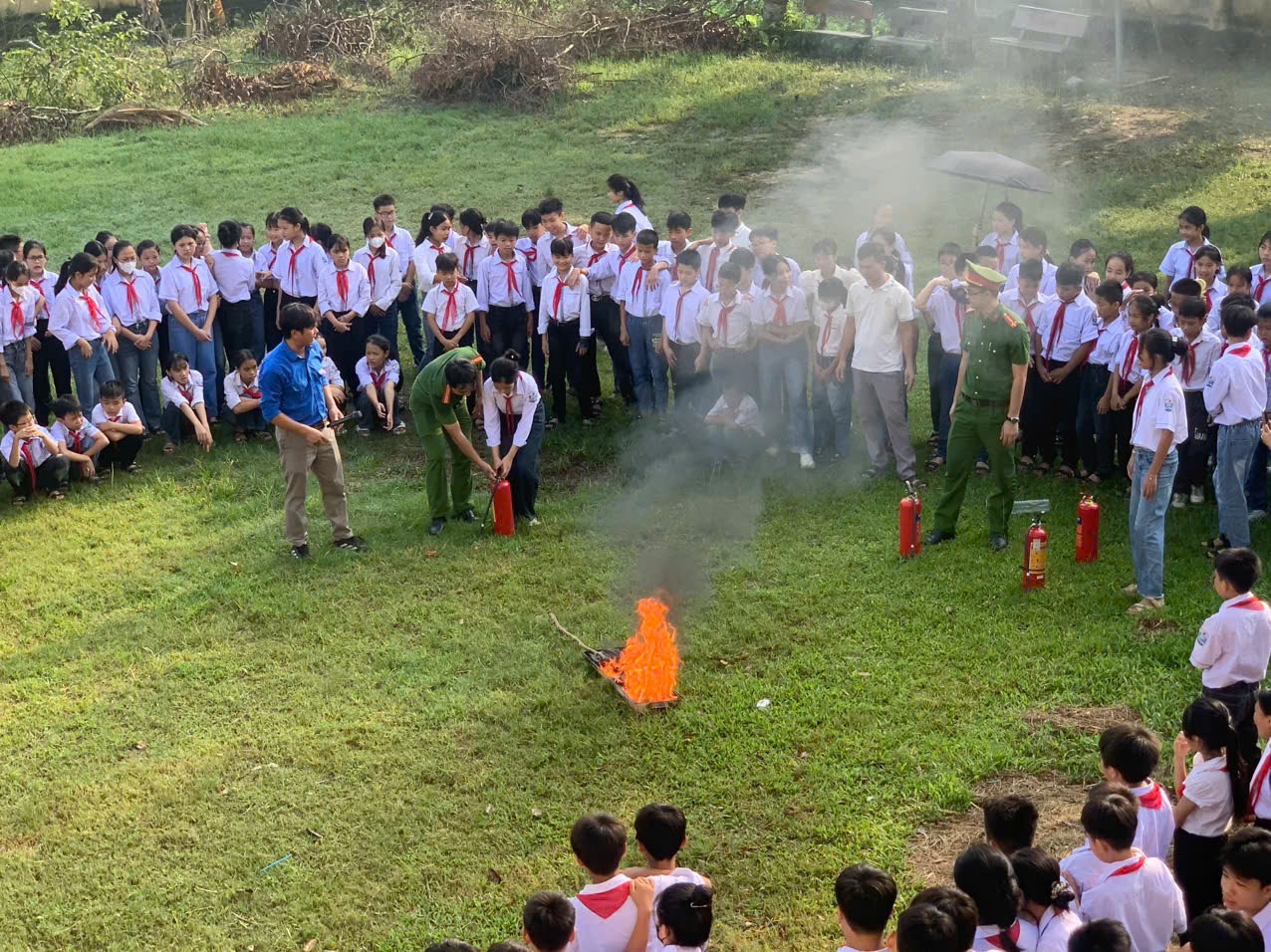 Các em học sinh được thực hành, trải nghiệm xử lý các tình huống cháy nổ và cách sử dụng bình chữa cháy xách tay