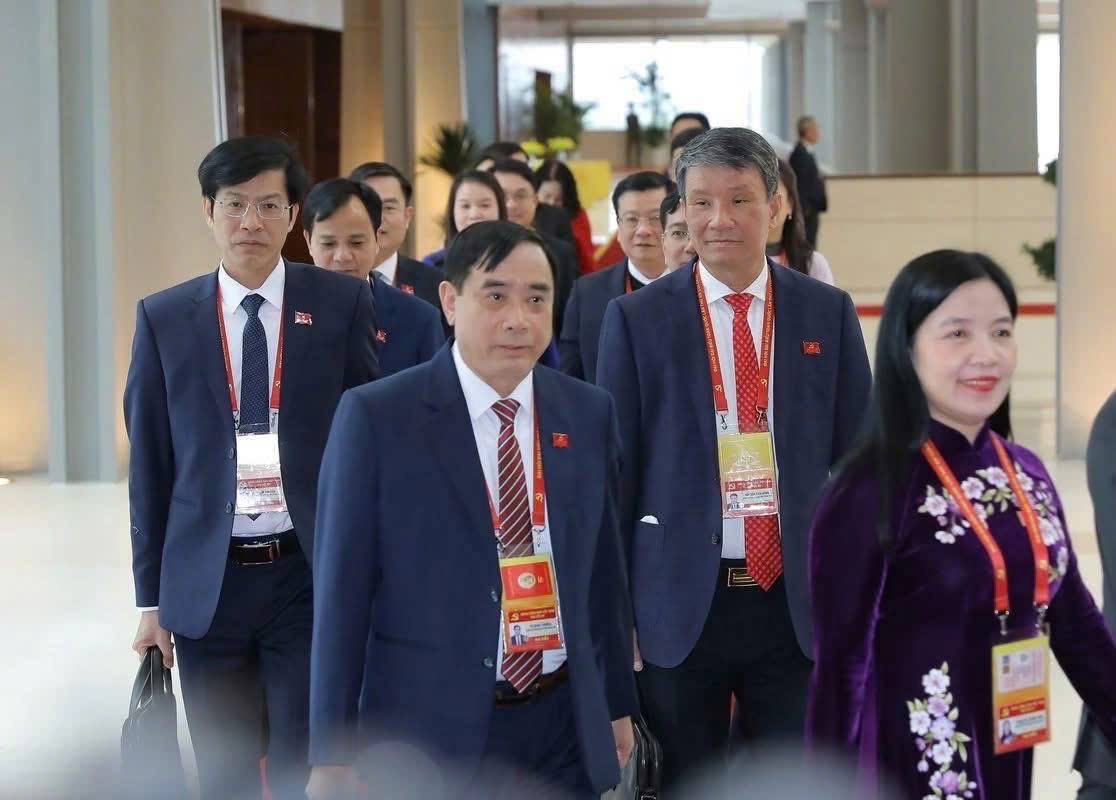 Các thành viên trong Đoàn đại biểu Đảng bộ tỉnh Thanh Hóa đến dự phiên bế mạc Đại hội XIV của Đảng.