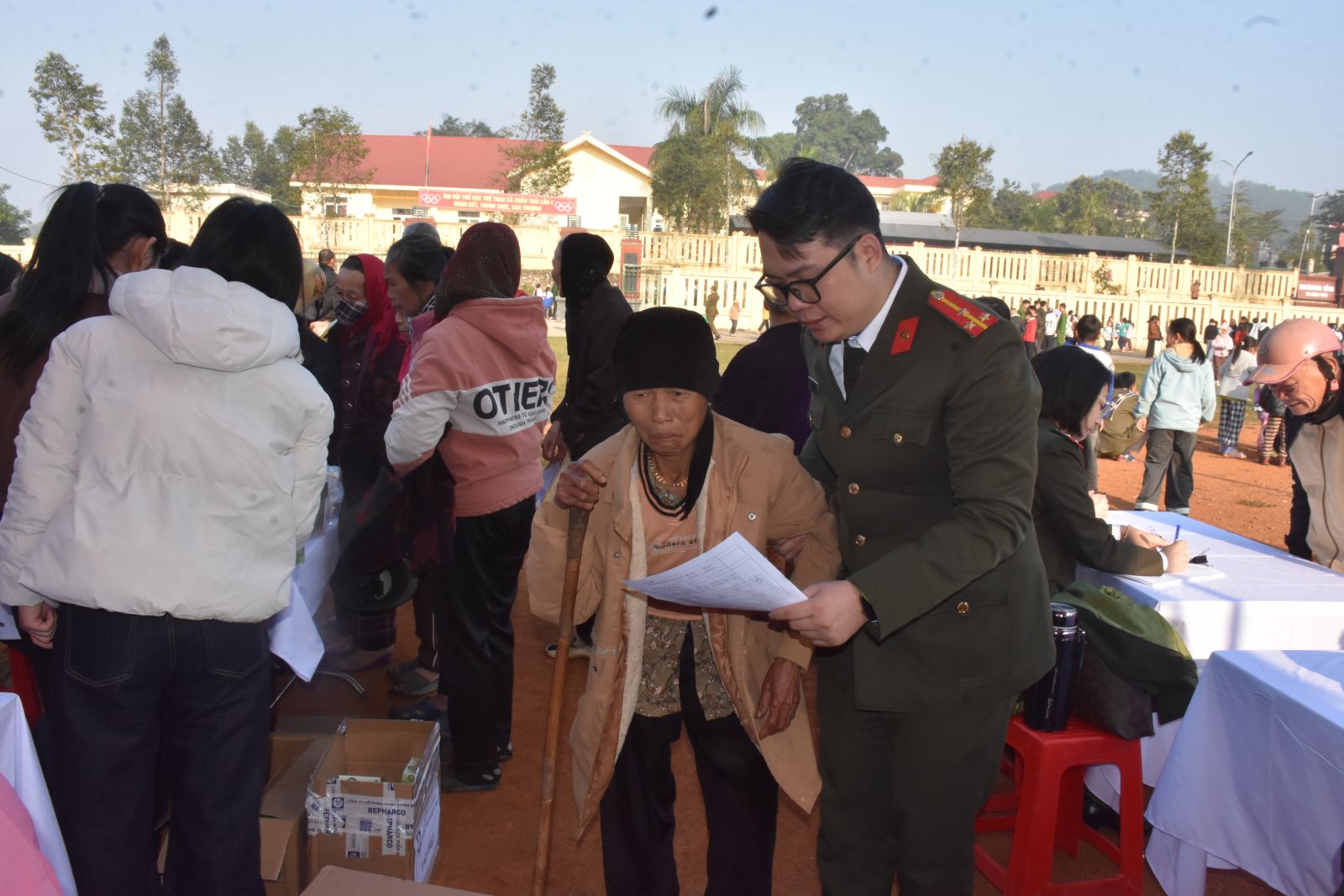 Cán bộ, chiến sĩ Công an tỉnh giúp người dân đến điểm tư vấn khám bệnh