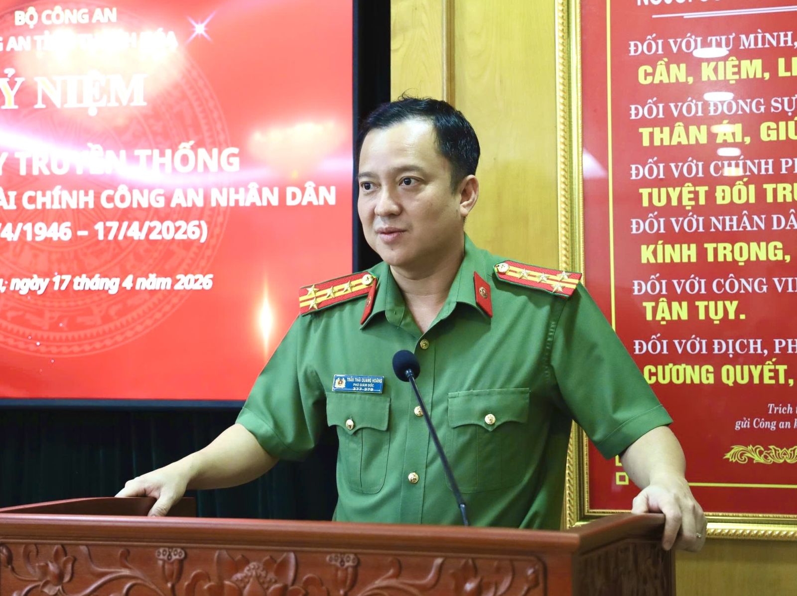 Nhân kỷ niệm 80 năm Ngày truyền thống lực lượng Tài chính Công an nhân dân (17/4/1946 - 17/4/2026), chiều 17/4, Phòng Hậu cần Công an tỉnh tổ chức buổi gặp mặt các thế hệ lãnh đạo, cán bộ, chiến sĩ lực lượng Tài chính Công an Thanh Hoá qua các thời kỳ. Đại tá Trần Thái Quang Hoàng, Phó Bí thư Đảng uỷ, Phó Giám đốc Công an tỉnh dự, chúc mừng tại buổi gặp mặt.