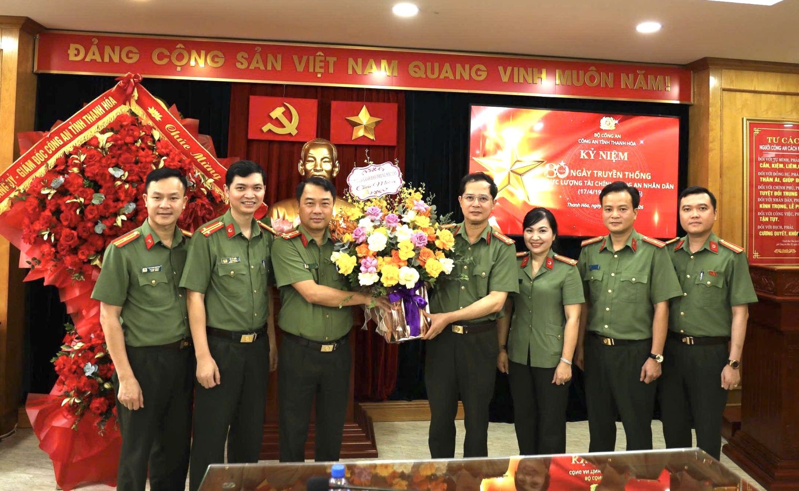 Thay mặt Đảng uỷ, Giám đốc Công an tỉnh, đồng chí Đại tá Trần Thái Quang Hoàng, Phó Giám đốc Công an tỉnh đã tặng hoa chúc mừng lực lượng Tài chính Công an Thanh Hoá.