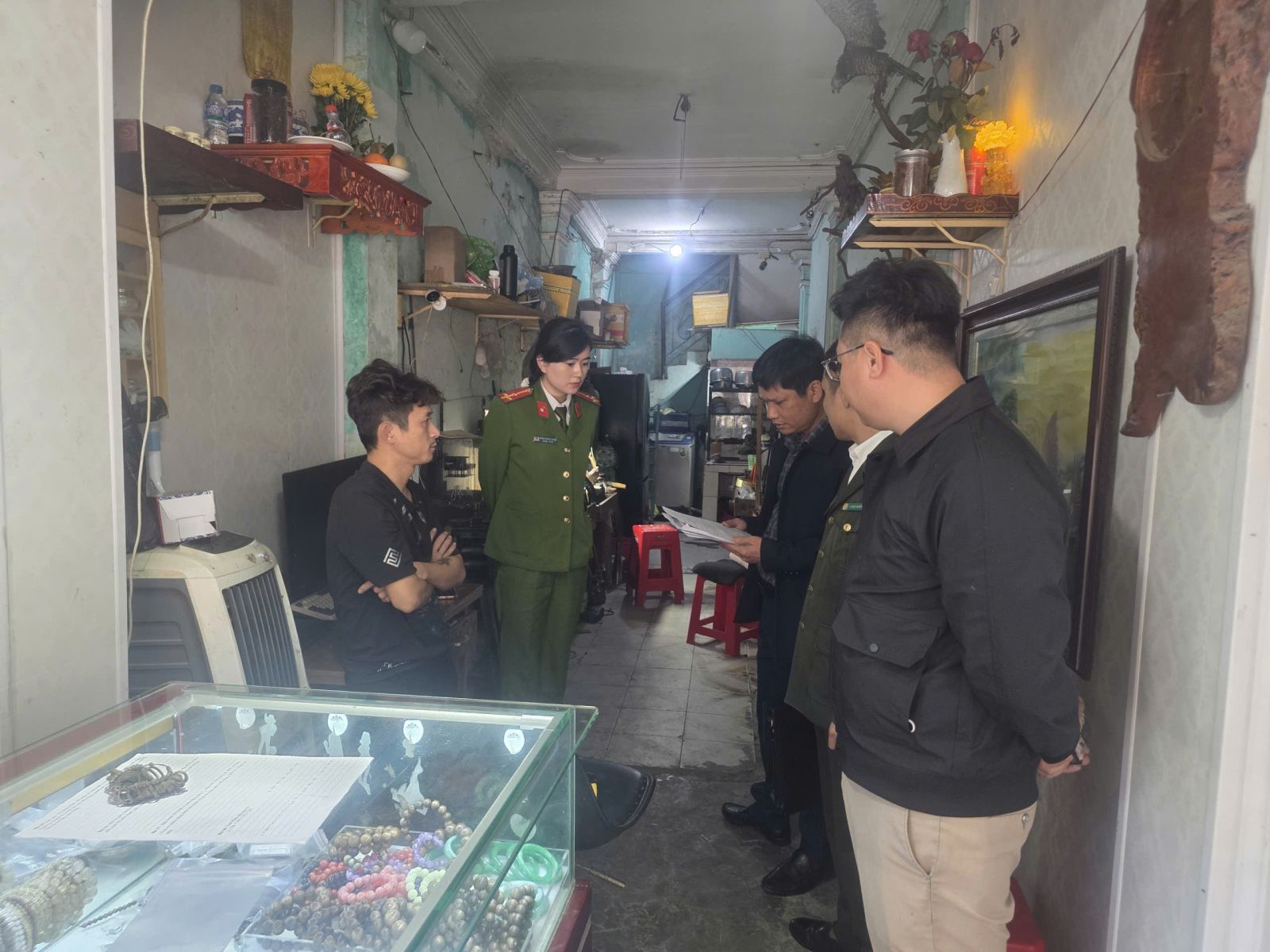 Trước đó, qua công tác nắm tình hình, Công an phường Hạc Thành đã tiến hành kiểm tra cơ sở kinh doanh vàng bạc Ngọc Thuấn tại phố Tống Duy Tân. Qua kiểm tra, lực lượng Công an đã phát hiện và thu giữ nhiều sản phẩm nghi được chế tác từ động vật hoang dã như: ngà voi, móng hổ, móng gấu, răng nanh báo… Toàn bộ tang vật đã được tạm giữ, niêm phong và trưng cầu giám định theo quy định.