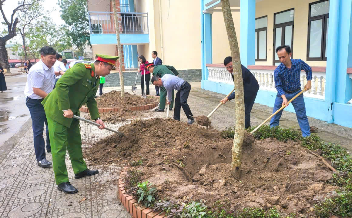 Công an xã Lưu Vệ phối hợp trồng cây, chăm sóc cây xanh tại khuôn viên Trường THCS Nguyễn Du.
