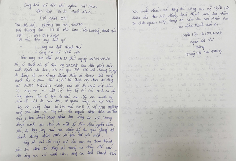 Trong Thư cảm ơn, chị Hương chia sẻ: Sau khi phát hiện mình đánh rơi tiền, tôi và gia đình đã rất hoang mang lo lắng đi tìm nhưng không thấy và không biết mình đánh rơi ở đâu. Đến 23h thì nhận được tin báo của đồng Phạm Nguyên Hùng, cán bộ tổ Cảnh sát khu vực Công an xã Vĩnh Lộc liên hệ để xác minh sự việc liên quan đến số tiền bị mất. Sau khi xác minh số tiền đó là của tôi, cơ quan Công an đã cùng hai công dân Vũ Mai Đức Anh và Vũ Ánh Phương tiến hành trao trả lại số tiền đó cho tôi. Trong hoàn cảnh gia đình bị mất số tiền lớn giữa đêm tối, sự tận tụy của các chiến sĩ Công an đã giúp chúng tôi nhanh chóng nhận được số tiền đã rơi mất.