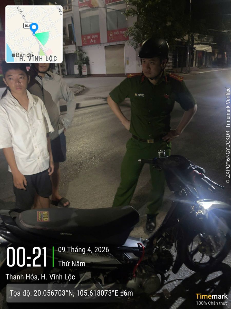 Khoảng 00 giờ 20 phút ngày 09/4/2026, trong quá trình tuần tra bảo đảm an ninh, trật tự trên địa bàn, Tổ công tác Công an xã Vĩnh Lộc phát hiện tại khu phố 2 có 2 nam thanh niên điều khiển 2 xe máy, có biểu hiện nghi vấn, di chuyển theo hướng từ xã Vĩnh Lộc đi xã Yên Trường nên đã ra tín hiệu dừng xe để kiểm tra hành chính.