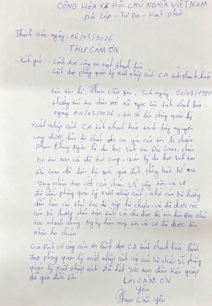 Xúc động trước sự hỗ trợ kịp thời và đầy nghĩa tình ấy, gia đình anh Phạm Văn Yêu đã gửi thư cảm ơn tới tập thể cán bộ, chiến sĩ Phòng Quản lý xuất nhập cảnh Công an tỉnh Thanh Hóa, bày tỏ sự trân trọng đối với tinh thần trách nhiệm, sự tận tụy và tấm lòng vì Nhân dân phục vụ của lực lượng Công an. Những việc làm tuy bình dị nhưng giàu tính nhân văn ấy đã góp phần lan tỏa hình ảnh đẹp về người chiến sĩ Công an bản lĩnh, nhân ái, luôn gần dân, vì Nhân dân phục vụ.