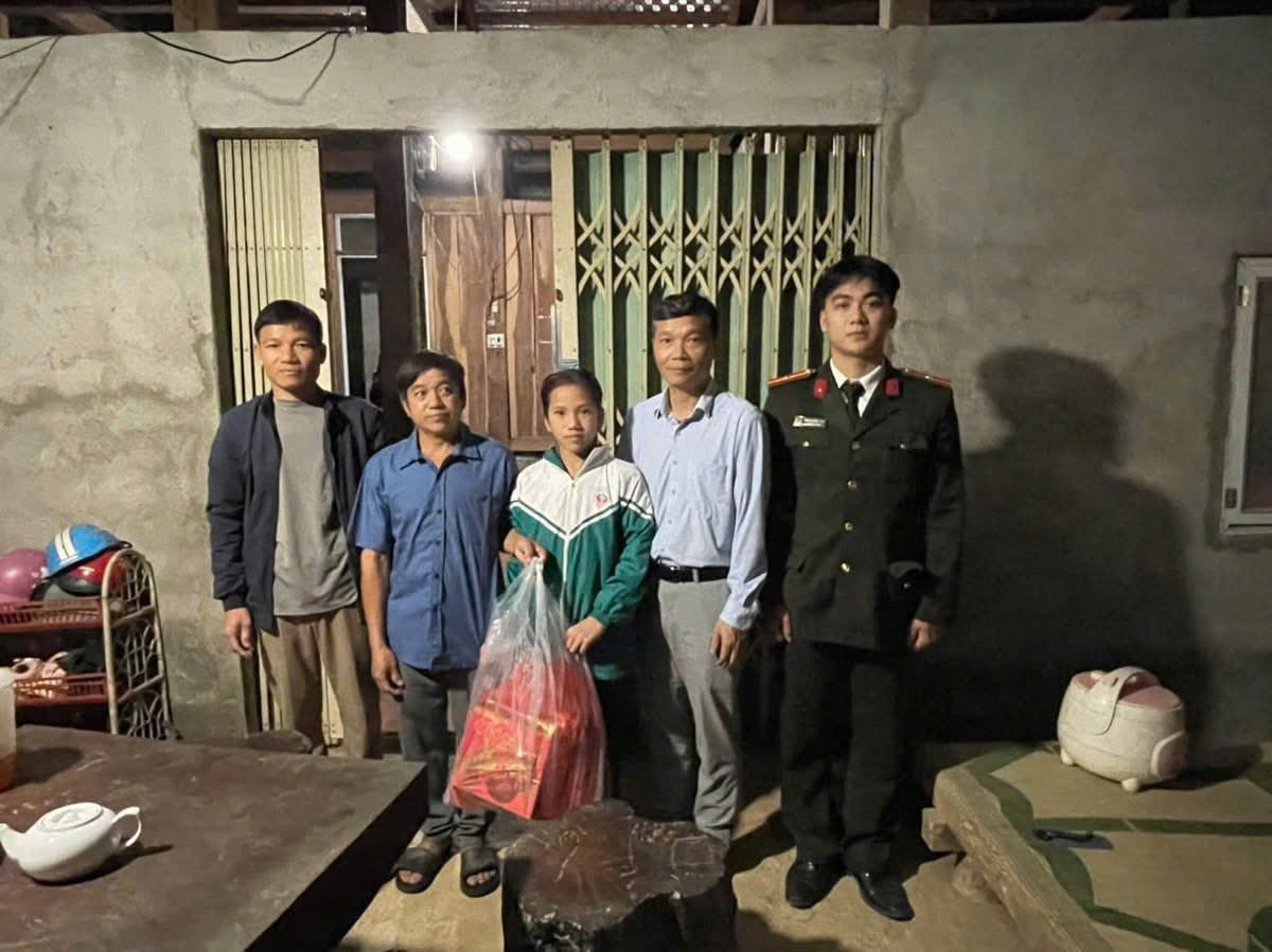Công an xã Sơn Điện đến từng hộ gia đình trao tặng quà Tết, động viên các em học sinh vượt khó trên địa bàn.