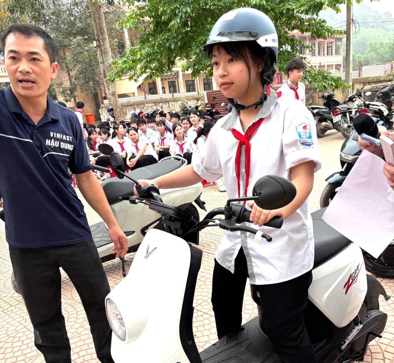 Đặc biệt, Công an xã Vân Du đã trực tiếp phối hợp hướng dẫn cho các em học sinh thực hành sử dụng và vận hành phương tiện tham gia giao thông an toàn. Các nội dung được truyền đạt cụ thể, trực quan như: kiểm tra phương tiện trước khi sử dụng, cách khởi động và điều khiển xe đúng kỹ thuật, giữ khoảng cách an toàn, đội mũ bảo hiểm đạt chuẩn, chấp hành tín hiệu đèn giao thông và các quy định của pháp luật khi tham gia giao thông. Qua đó giúp các em học sinh không chỉ hiểu lý thuyết mà còn biết cách vận dụng vào thực tế hằng ngày.
