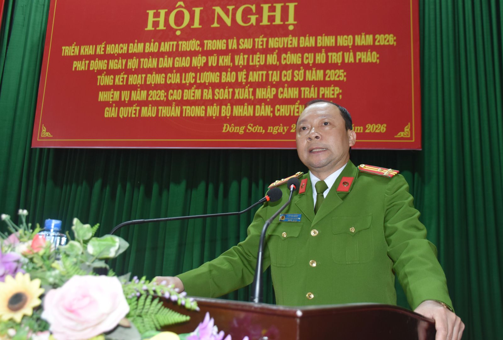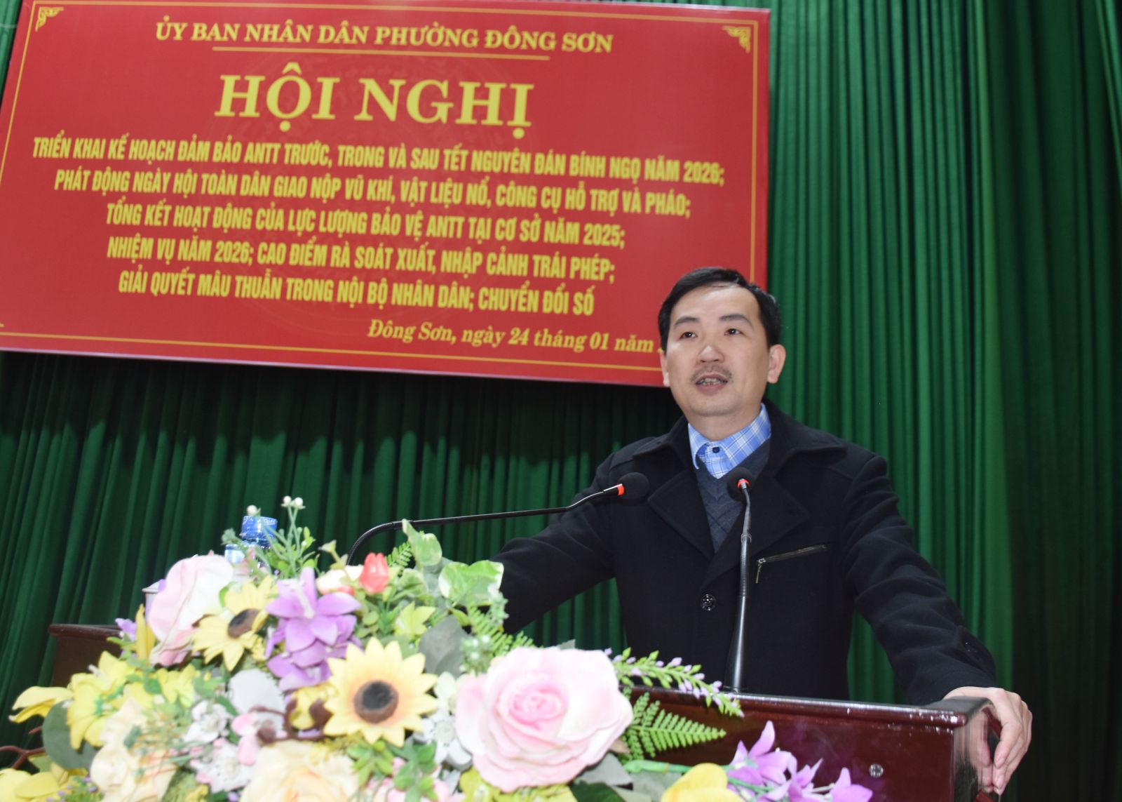 Ông Lê Anh Đức, Phó Bí thư Đảng ủy, Chủ tịch UBND phường Đông Sơn khẳng định: Bảo đảm an ninh, trật tự là nhiệm vụ chính trị đặc biệt quan trọng, có ý nghĩa then chốt trong việc phục vụ bầu cử đại biểu Quốc hội khóa XVI và HĐND các cấp, cũng như để Nhân dân vui Xuân, đón Tết Nguyên đán Bính Ngọ 2026 an toàn. Do đó lực lượng Công an phường cần tiếp tục phát huy vai trò nòng cốt, chủ động nắm chắc tình hình, triển khai quyết liệt đợt cao điểm tấn công, trấn áp các loại tội phạm; tăng cường quản lý vũ khí, vật liệu nổ, pháo; kịp thời phát hiện, giải quyết các mâu thuẫn phát sinh ngay từ cơ sở, không để hình thành điểm nóng phức tạp về ANTT.