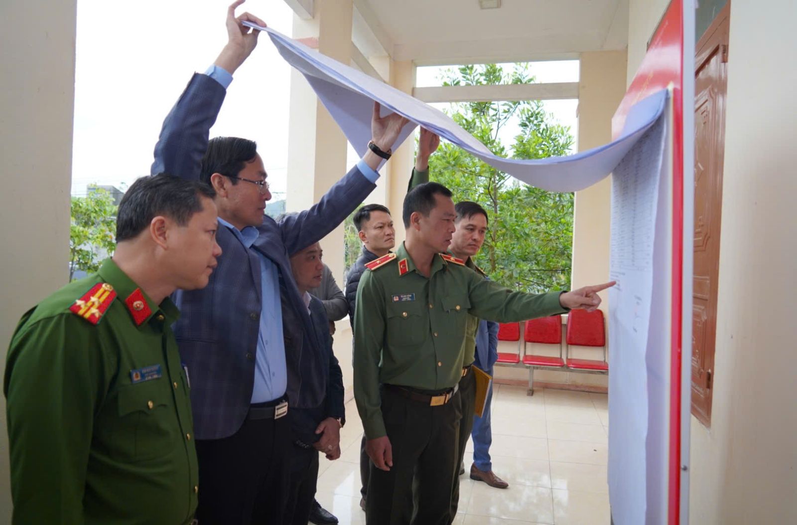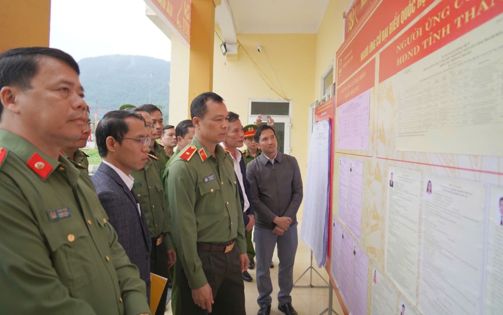 Đồng chí Giám đốc Công an tỉnh kiểm tra danh sách đại biểu ứng cử, danh sách cử tri tại Khu vực bỏ phiếu số 4, Tổ dân phố Hồng Phong, phường Hải Lĩnh.