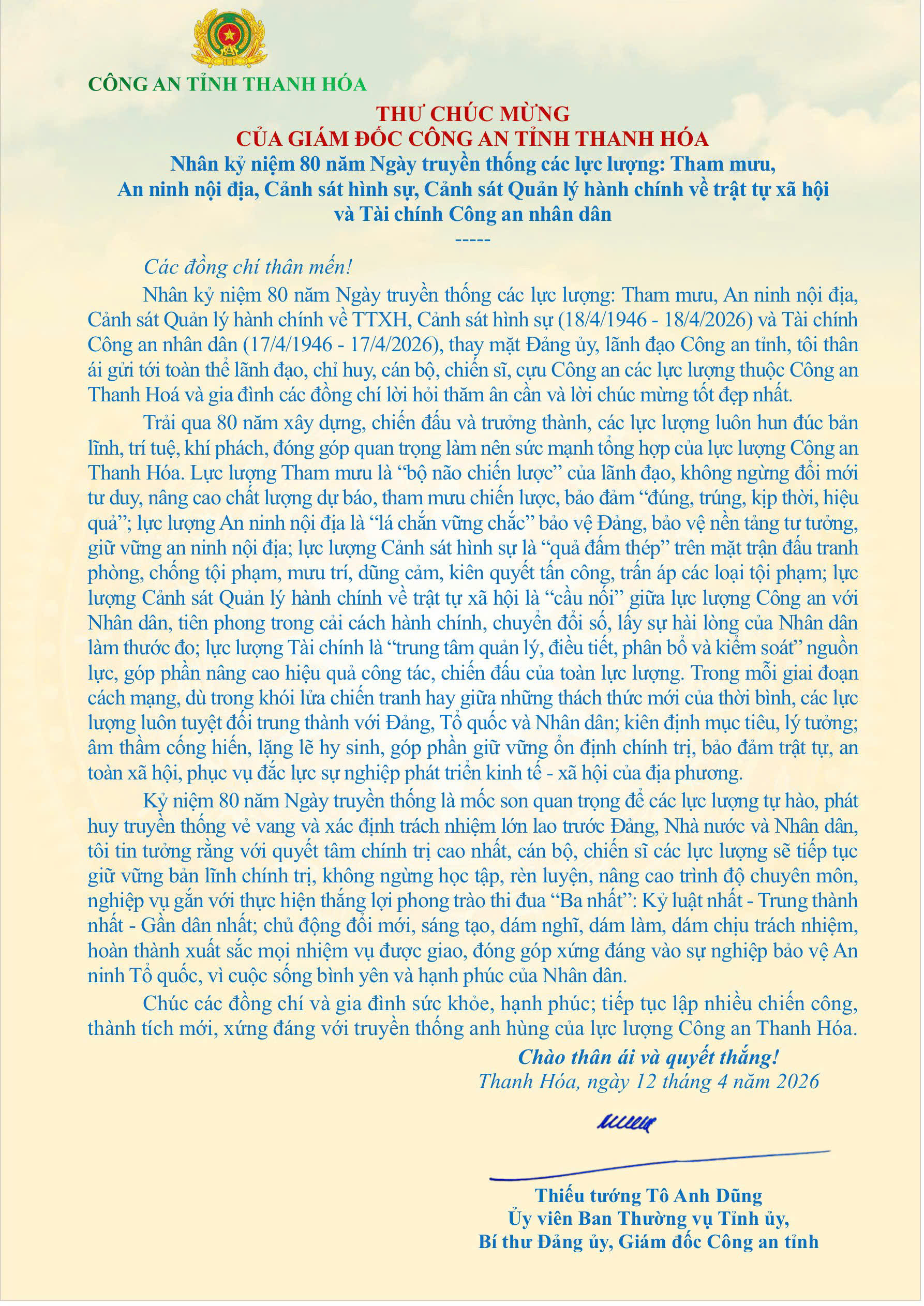Thư chúc mừng của Giám đốc Công an tỉnh nhân kỷ niệm 80 năm Ngày truyền thống các lực lượng: Tham mưu, An ninh nội địa, Cảnh sát hình sự, Cảnh sát Quản lý hành chính về trật tự xã hội và Tài chính Công an nhân dân