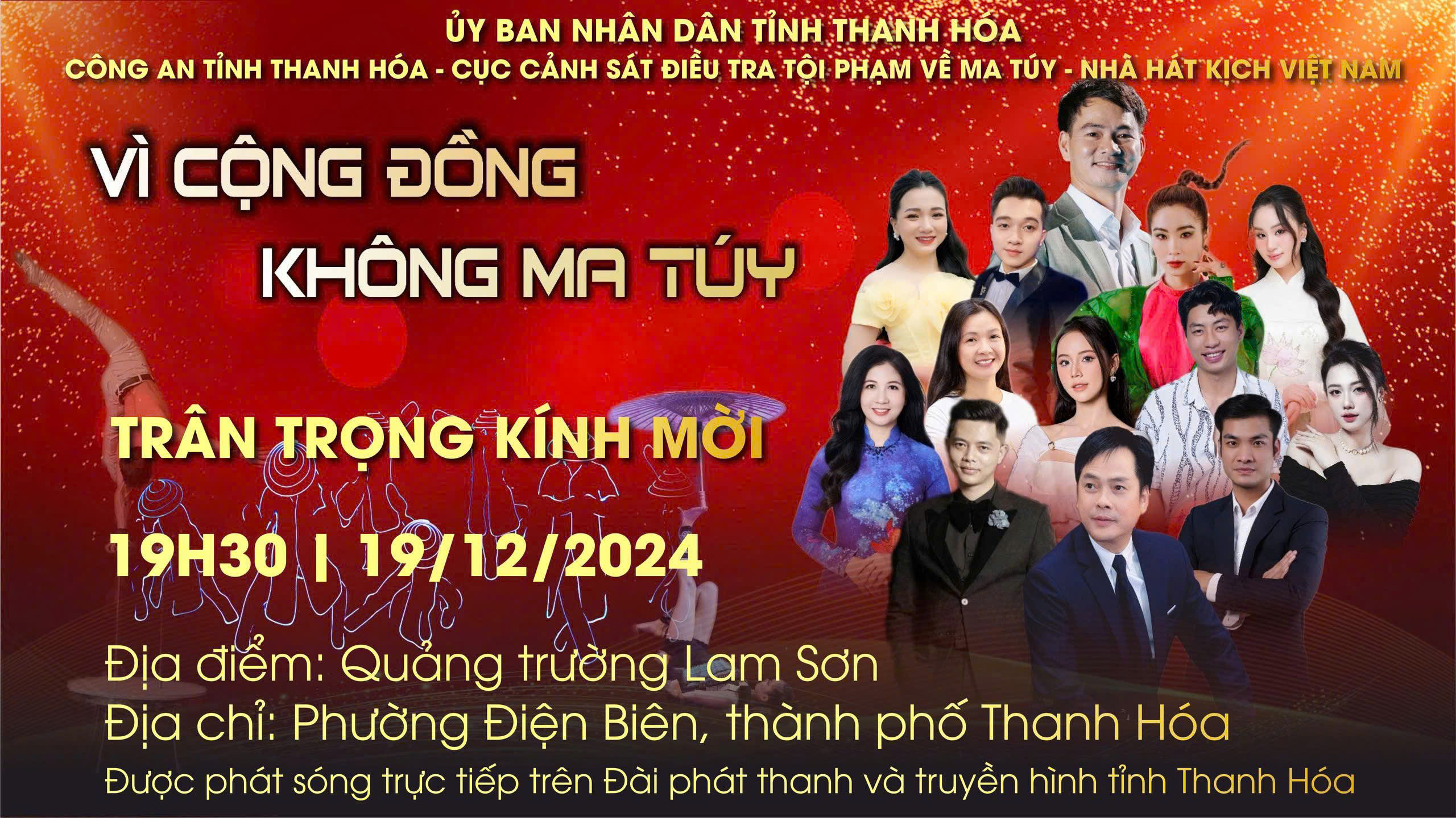Tối nay (19/12), tại Quảng trường Lam Sơn, phường Điện Biên, thành phố Thanh Hóa, UBND tỉnh Thanh Hóa phối hợp cùng Cục Cảnh sát Điều tra tội phạm về ma túy, Bộ Công an, Nhà hát kịch Việt Nam, Công an tỉnh Thanh Hóa tổ chức Chương trình "Vì cộng đồng không ma túy". Chương trình được truyền hình trực tiếp vào lúc 20 giờ 10 phút trên Đài Phát thanh và Truyền hình Thanh Hóa và livestream trên các nền tảng số của Đài.