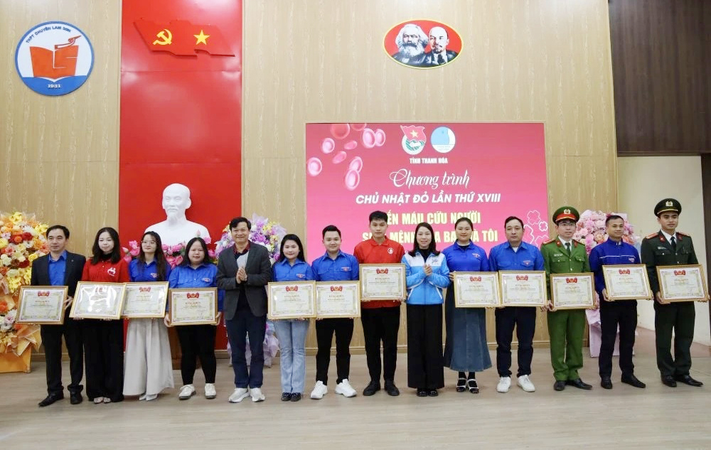 Tại chương trình, Ban Tổ chức đã trao Bằng khen của Ban Chấp hành Tỉnh đoàn Thanh Hóa cho các tập thể, cá nhân có thành tích xuất sắc trong tuyên truyền, vận động tham gia Ngày hội hiến máu tình nguyện “Chủ nhật Đỏ” năm 2026. Trong đó, Công an tỉnh có 1 tập thể và 2 cá nhân được khen thưởng.