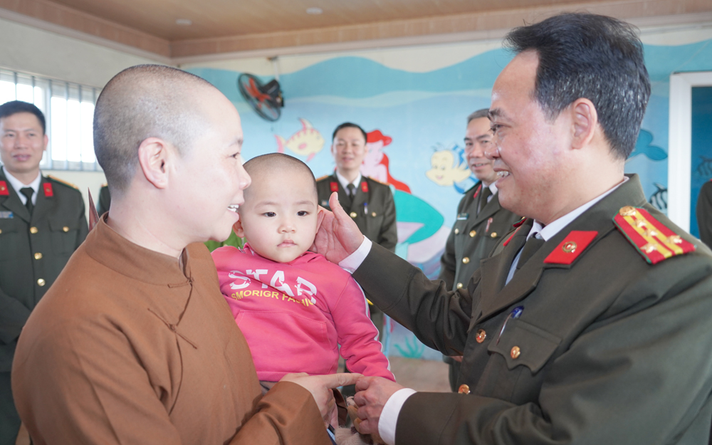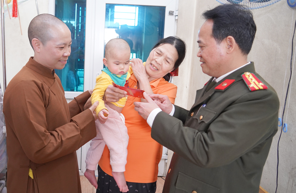 Tiếp tục hành trình lan tỏa yêu thương, Đoàn đã tới thăm các cháu nhỏ mồ côi đang được nuôi dưỡng tại Chùa Hồi Long, xã Hoằng Thanh. Tại đây, đồng chí Phó Giám đốc và các thành viên trong đoàn đã tặng những phần quà Tết hết sức ý nghĩa đến nhà chùa và 27 cháu mồ côi đang được chăm sóc, nuôi dưỡng tại đây. Đại tá Lê Ngọc Anh bày tỏ sự trân trọng trước tấm lòng của sư trụ trì và mong muốn các cháu sẽ luôn nhận được sự quan tâm của cộng đồng để trưởng thành trong tình yêu thương. Đặc biệt trong dịp Tết cổ truyền của dân tộc, với món quà của Công an tỉnh, sẽ góp phần chung tay cùng nhà chùa để các cháu có một cái tết đủ đầy, đầm ấm.