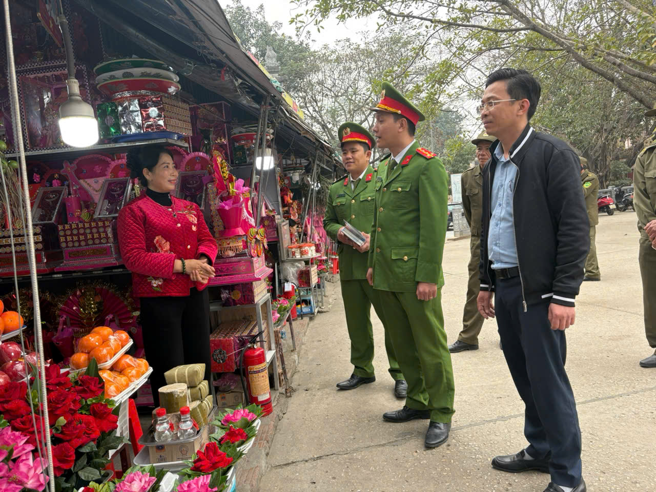 Lực lượng Cảnh sát PCCC&CNCH Công an tỉnh phối hợp tuyên truyền cho các hộ kinh doanh nâng cao nhận thức về phòng chống cháy nổ tại Đền Sòng