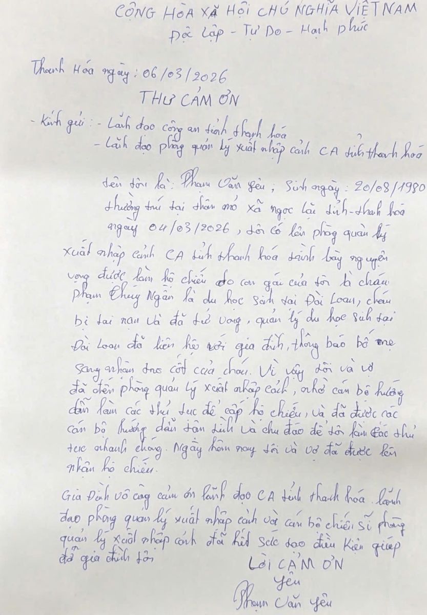 Trong thư anh Phạm Văn Yêu xúc động viết: “...Ngày 04/03/2026, tôi có lên Phòng Quản lý xuất nhập cảnh Công an tỉnh Thanh Hóa trình bày nguyên vọng được làm hộ chiếu do con gái của tôi là cháu Phạm Thúy Ngân là du học sinh tại Đài Loan, cháu bị tai nạn và đã tử vong, quản lý du học sinh tại Đài Loan đã liên hệ với gia đình, thông báo bố mẹ sang nhậu tro cốt của cháu. Vì vậy tôi và vợ đã đến Phòng Quản lý xuất nhập cảnh, nhờ cán bộ hướng dẫn làm các thủ tục để cấp hộ chiếu, và đã được các cán bộ hướng dẫn tận tình và chu đáo để tôi làm các thủ tục nhanh chóng. Ngày hôm nay tôi và vợ đã được lên nhận hộ chiếu. Gia Đình vô cùng cảm ơn lãnh đạo Công an tỉnh Thanh Hóa, lãnh đạo Phòng Quản lý xuất nhập cảnh và cán bộ chiến sĩ Phòng Quản lý xuất nhập cảnh đã hết sức tạo điều kiện giúp đỡ gia chính tôi.”
