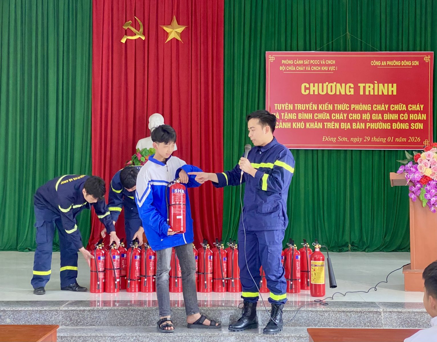 Tuyên truyền pháp luật và tặng bình chữa cháy cho hộ gia đình khó khăn tại phường Đông Sơn