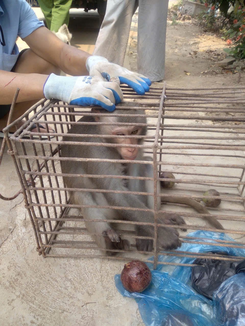 Lực lượng chức năng tiếp nhận 1 cá thể khỉ đuôi dài đực, màu xám, nặng khoảng 8 kg của người dân giao nộp